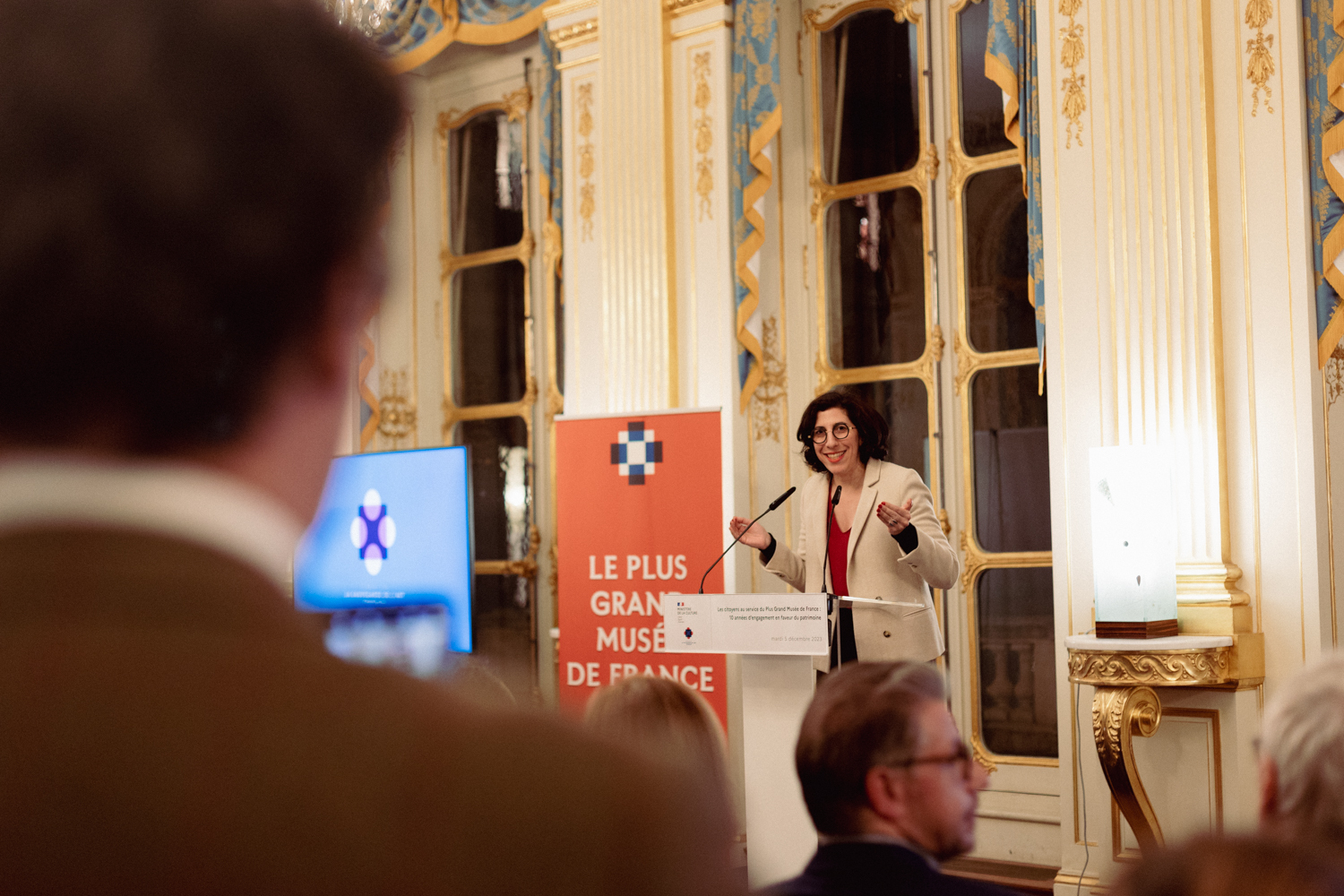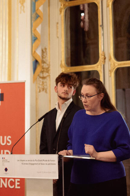 « Je suis tellement heureuse de vous accueillir pour les 10 ans de l’opération Le Plus Grand Musée de France. C’était important que ce soit ici au Ministère de la Culture, ministère du patrimoine de toute la France, pas que de nos musées, mais d’un patrimoine de proximité. […] Avec cette opération, l’objectif, et je vois tous ces jeunes réunis, ce qui est formidable, c’est de vous faire connaître davantage l’histoire de notre pays, parce qu’on a besoin de cet ancrage. […] Je voulais vous remercier et vous redire tout mon soutien car, oui, il y a plus de chefs-d’œuvre dispersés dans notre pays, notamment dans nos églises et chapelles, qu’au musée du Louvre. J’aimerais vraiment que l’engouement de ces jeunes qui sont avec nous crée un élan et qu’il y ait 10 années tout aussi magnifiques à venir ! »