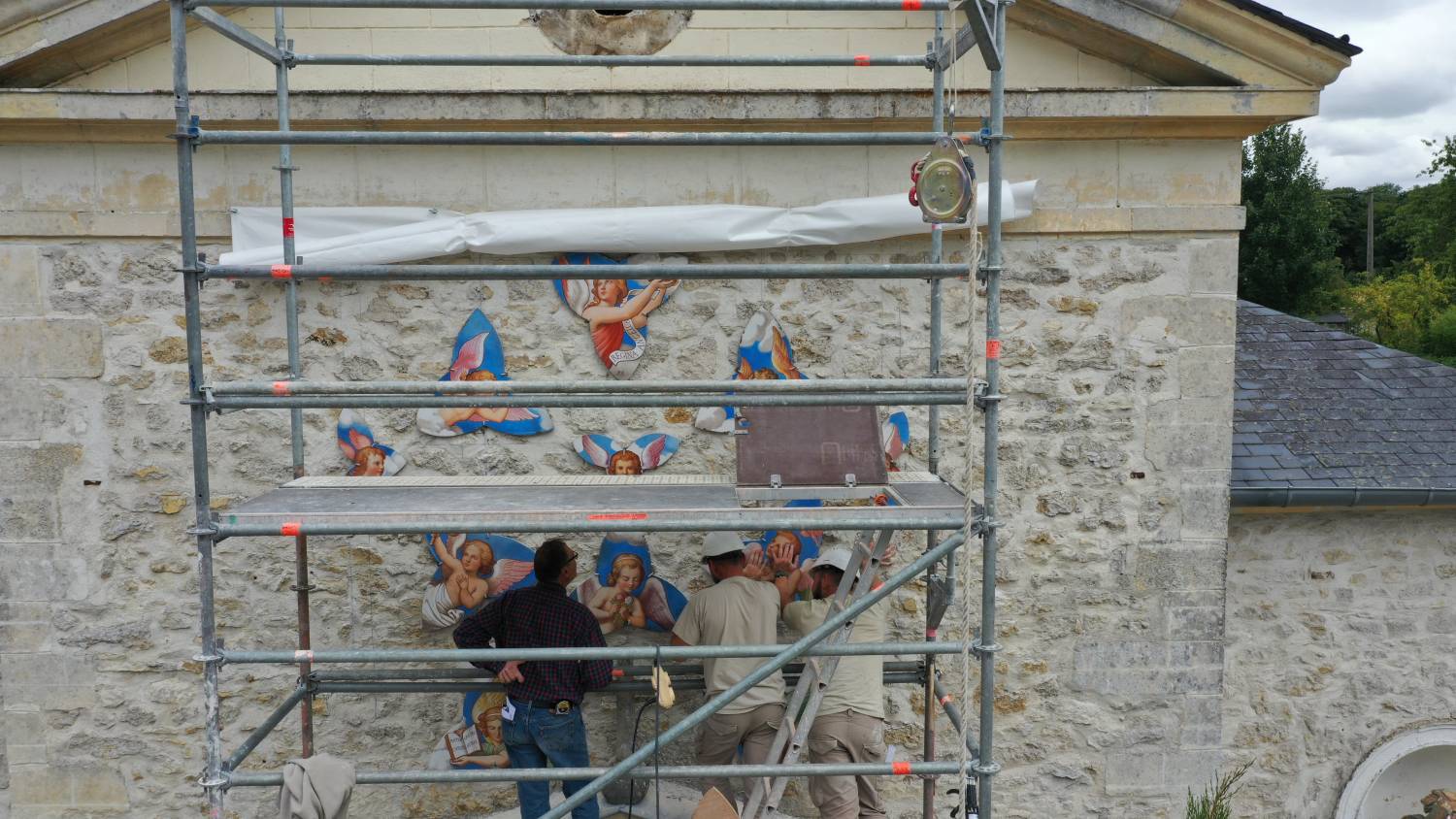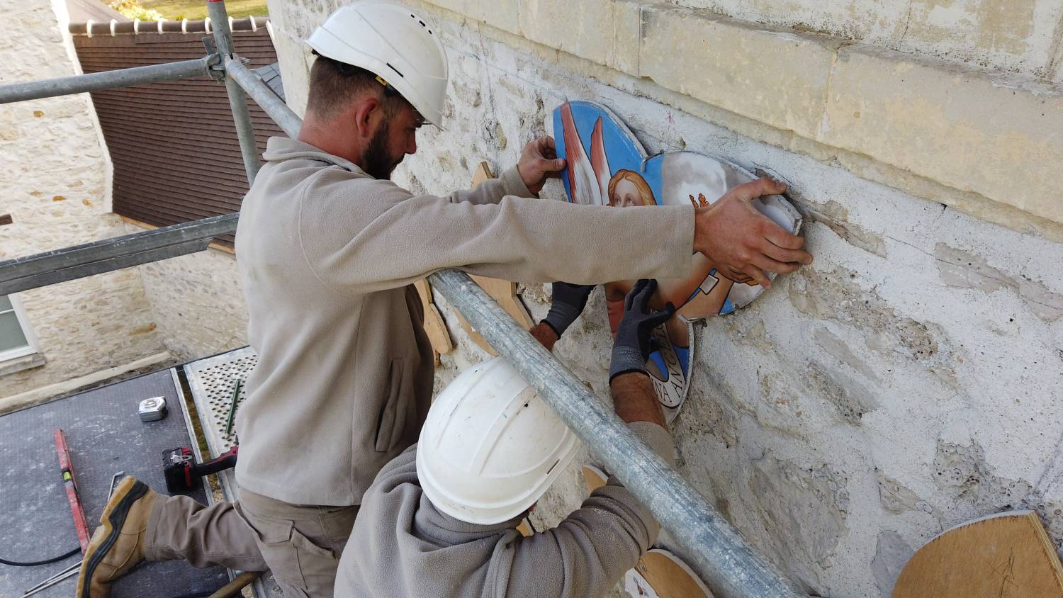 Pose des émaux ©Thierry Beaucap« Selon la volonté du conseil municipal, une équipe de bénévoles aux compétences très variées, a fait des propositions pour faire connaître ce patrimoine local. Nous étions en présence de multiples peintures émaillées sur lave qui se trouvaient dans une église pour laquelle elles n’avaient pas été conçues, comme des tableaux ou des toiles accrochés dans un maison de plaisance ou dans un musée. Par ailleurs, ces œuvres étaient les éléments d’un discours que nous nous devions de rendre intelligible même si l’étroitesse de la façade de l’église ne nous permettait pas de le reproduire in extenso. Il nous fallait prendre en compte la lecture des fresques de la chapelle Sainte-Marie de Chaalis que Paul Balze avait restaurées mais aussi la carrière de l’artiste et ses sources d’inspiration. Nous avons donc choisi un ordonnancement vertical en tenant compte également de l’architecture et du décor de la façade de Fontaine. In fine, c’est toujours le thème marial qui organise cette nouvelle installation. Tout fut fait pour assurer une bonne lisibilité (QR code in situ donnant accès au film) et une réversibilité avec le souci de protéger ces belles œuvres du XIXe siècle »
