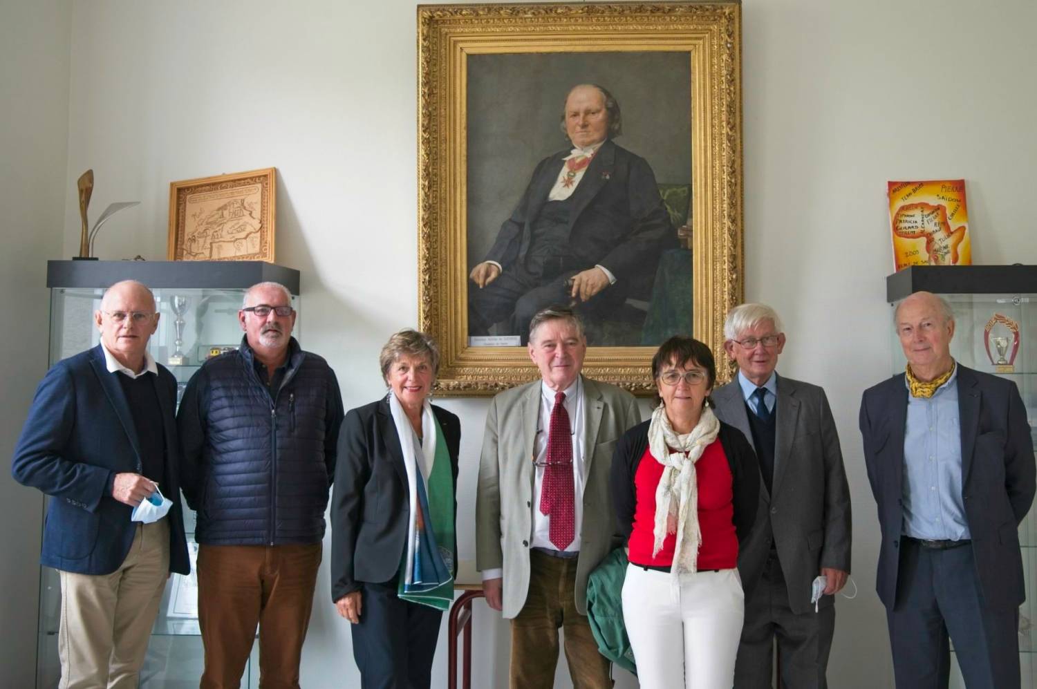 Sous le portrait d’Achille du Clésieux, de gauche à droite : M. Presse, président de l’association de gestion du lycée et sa directrice Mme Meslet avec Jean-Michel Leniaud, Jocelyne Cacciali, présidente, Olivier de Rohan Chabot, président de la Sauvegarde et Monsieur Baudouin Capelle, © André Bouguen