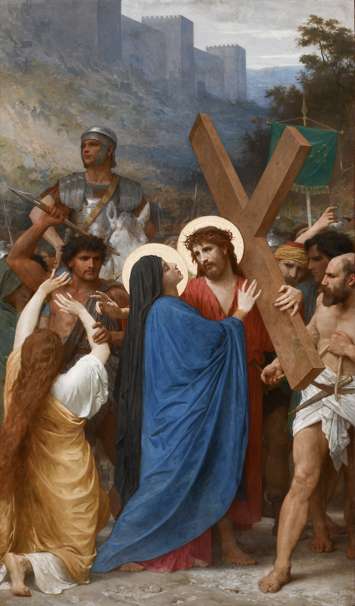 Le paysage lointain, notamment les murailles de Jérusalem, est traité par touches plus nerveuses, contrastant avec la facture lisse et lumineuse généralement associée à Bouguereau. La scène voisine est plus sobre, davantage centrée sur le Christ. Adaptées aux murs étroits, les compositions sont très verticales, et Madeleine y adopte une pose dramatique.