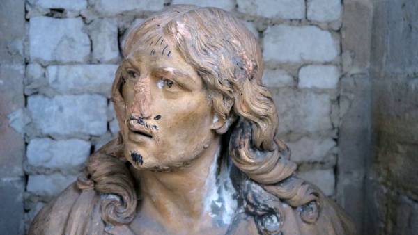 Œuvre d’un artiste inconnu du XVIIe siècle, cette statue en terre cuite est l’unique élément restant d’un ensemble qui, à l’origine, comprenait aussi une statue de la Vierge et un Christ en Croix.