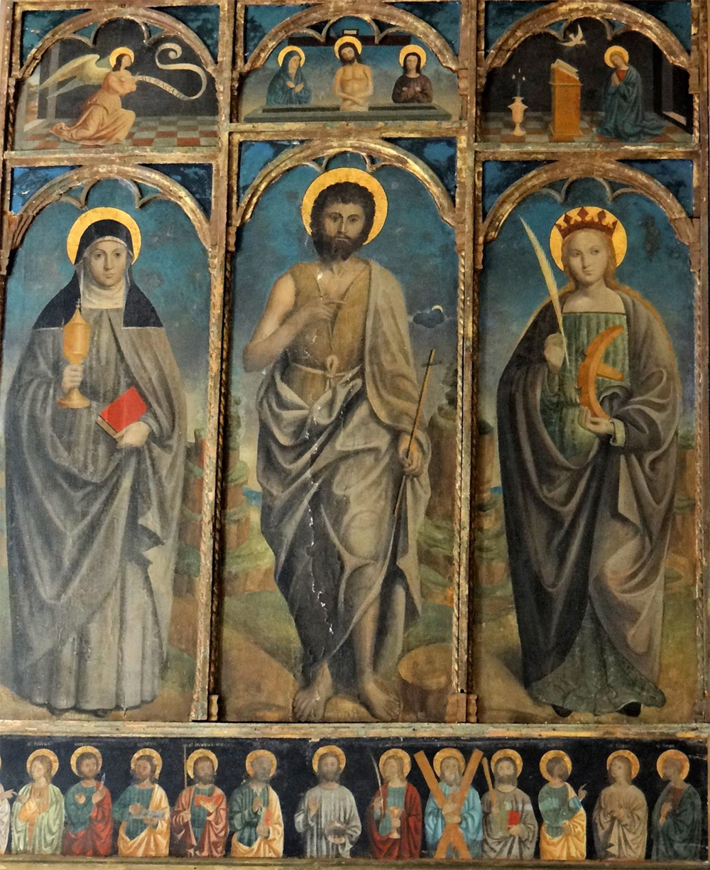 Il se présente sous la forme d’un triptyque à sept compartiments. Sur ses panneaux centraux, élégamment ceints par de délicates boiseries sculptées, sont représentés un Saint Jean-Baptiste entouré par les Saintes Claire d’Assise et Catherine d’Alexandrie.