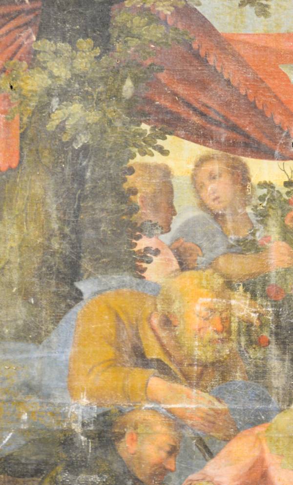 Coudray-Montceaux (91) – Église Saint-Etienne. Mariage Mystique de sainte Catherine. Anonyme, XVIème siècle« Inscrit au titre des Monuments historiques depuis 1974, ce Mariage mystique de sainte Catherine a essuyé les affres du temps et est aujourd’hui en péril. L’encrassement, les perforations et le vernis jauni troublent la lecture générale mais dissimulent d’autres éléments plus alarmants : la perte de tension de la toile peut amener à terme des déchirures ou de la perte irrémédiable de matière picturale. Il ne faudrait pourtant pas un chantier titanesque pour que cette œuvre retrouve sa stabilité et révèle tout son potentiel. Êtes -vous prêt à sauver les « jeunes mariés » de l’église Saint-Étienne ? »