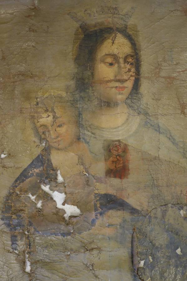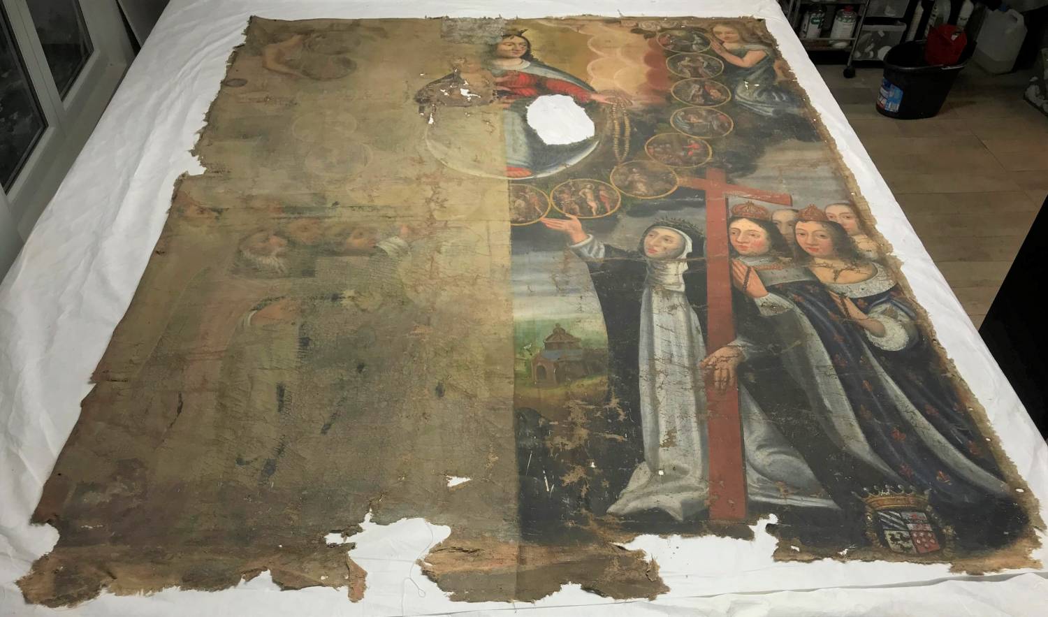 Le sauvetage de La Donation du Rosaire débute par sa redécouverte fortuite en 2018 : remisée sans aucune mesure de conservation, l’œuvre avait été négligemment oubliée dans le grenier du presbytère de Saint-Laurent-sur-Oust. La toile est ainsi restée près de 40 ans dans un environnement qui ne pouvait que dégrader la composition du XVIIème siècle. Alors que la commune vient de vendre l’ancien presbytère, la toile refait surface, à peine lisible tant l’encrassement est conséquent.