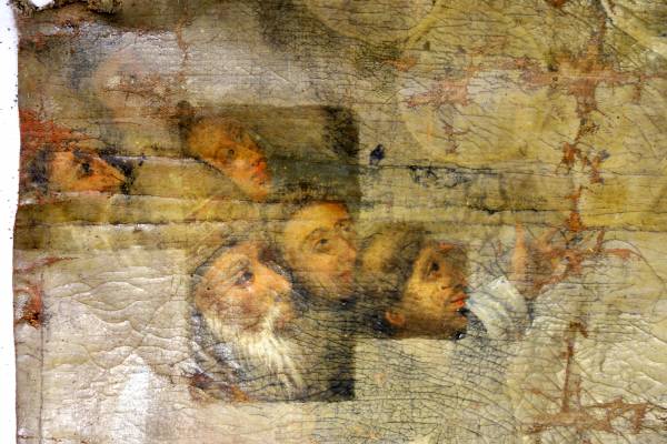 Probablement issue d’un retable, l’œuvre a été déposée et remisée en raison de son état général déplorable il y a plusieurs décennies.