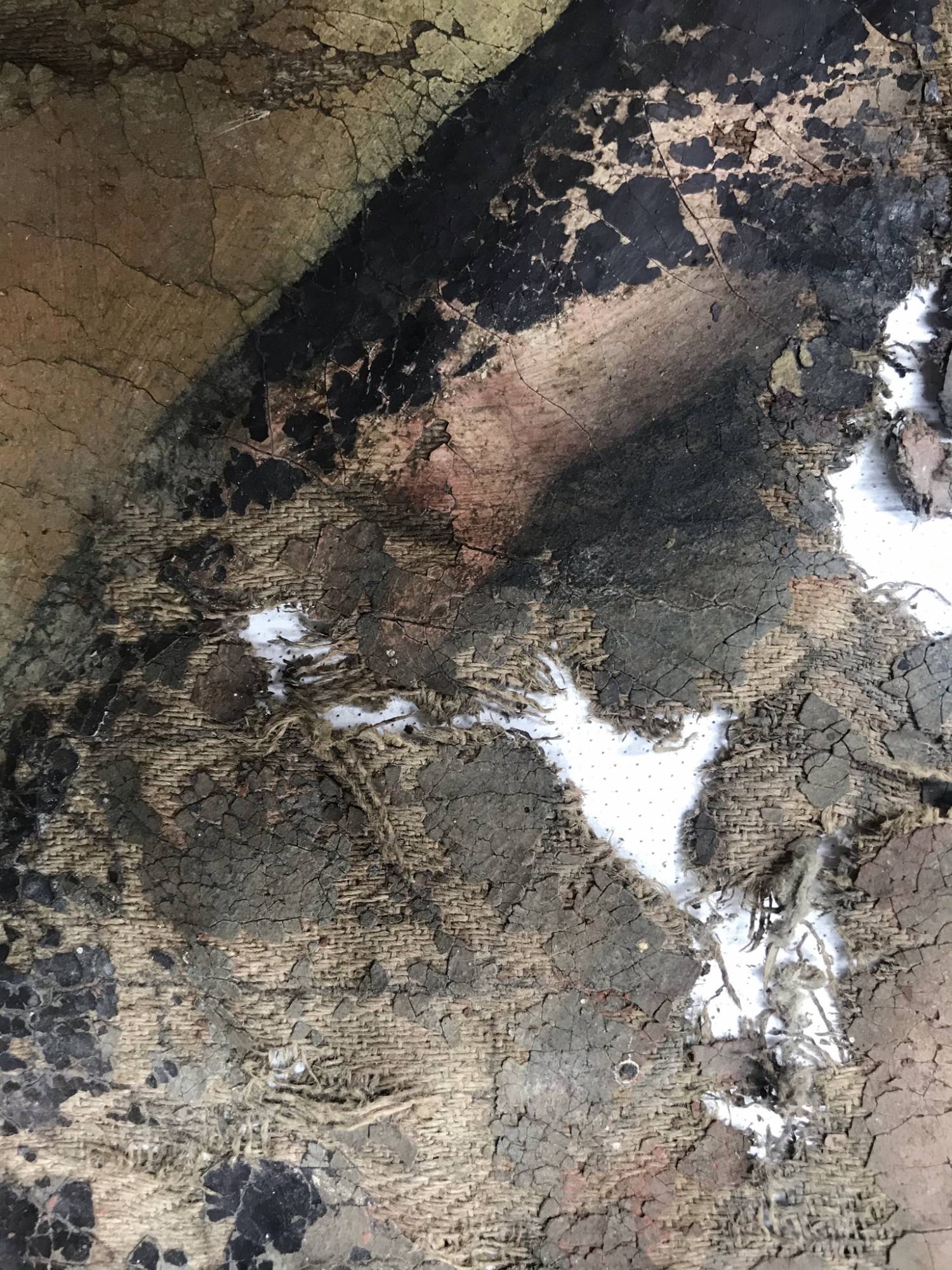 Ces dégâts ont engendré des lacunes importantes ainsi que des pertes de la couche picturale. Dans la partie inférieure de la toile, c’est près d’une dizaine de centimètres de l’œuvre qui sont ainsi déchirés ou manquants.
