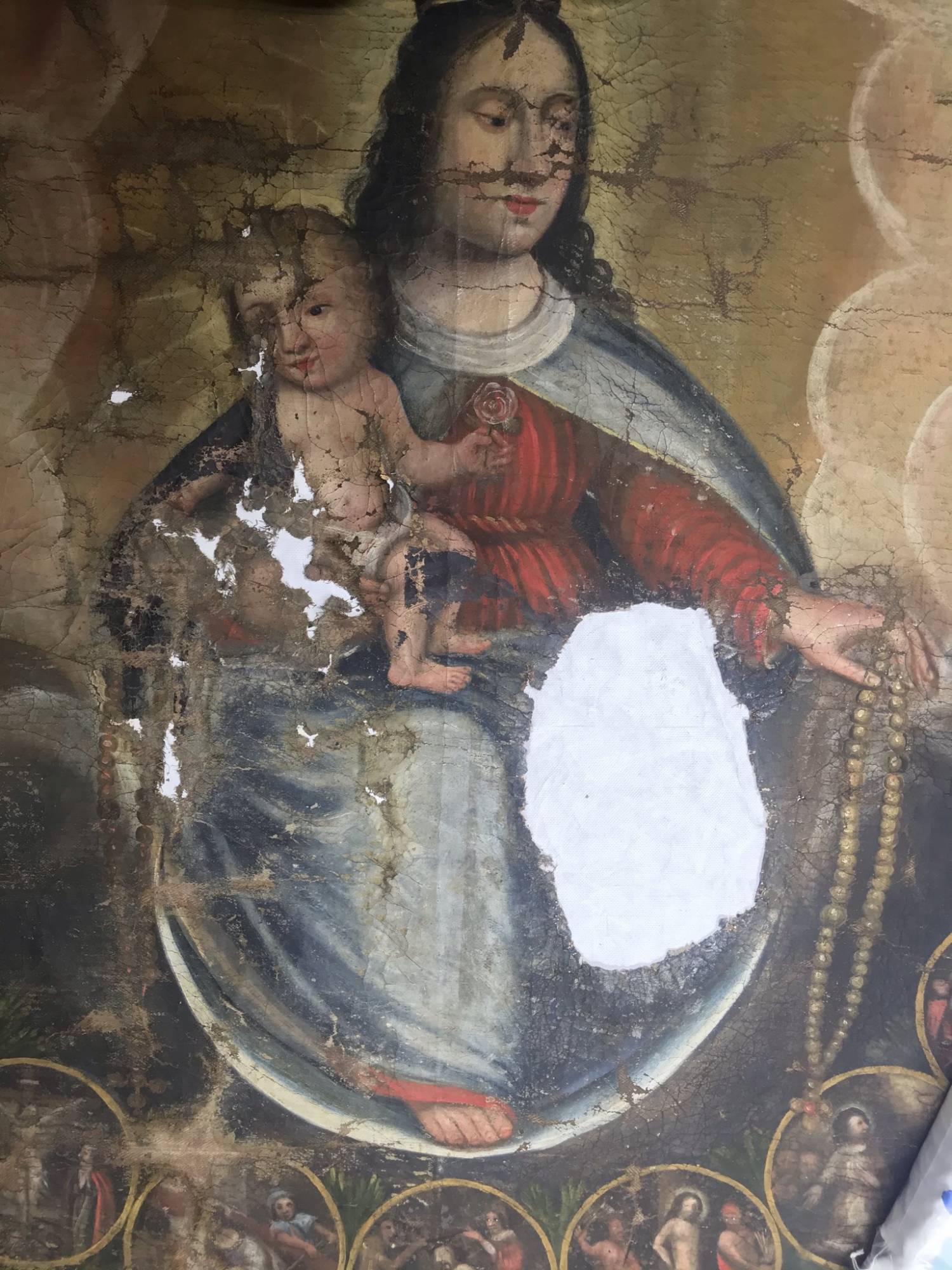 La Donation du Rosaire présente les traces de plusieurs tentatives de restaurations, certainement effectuées au XIXème siècle et au XXème siècle. Plusieurs zones ont ainsi été nettoyées et des repeints appliqués pour les lacunes les plus importantes.