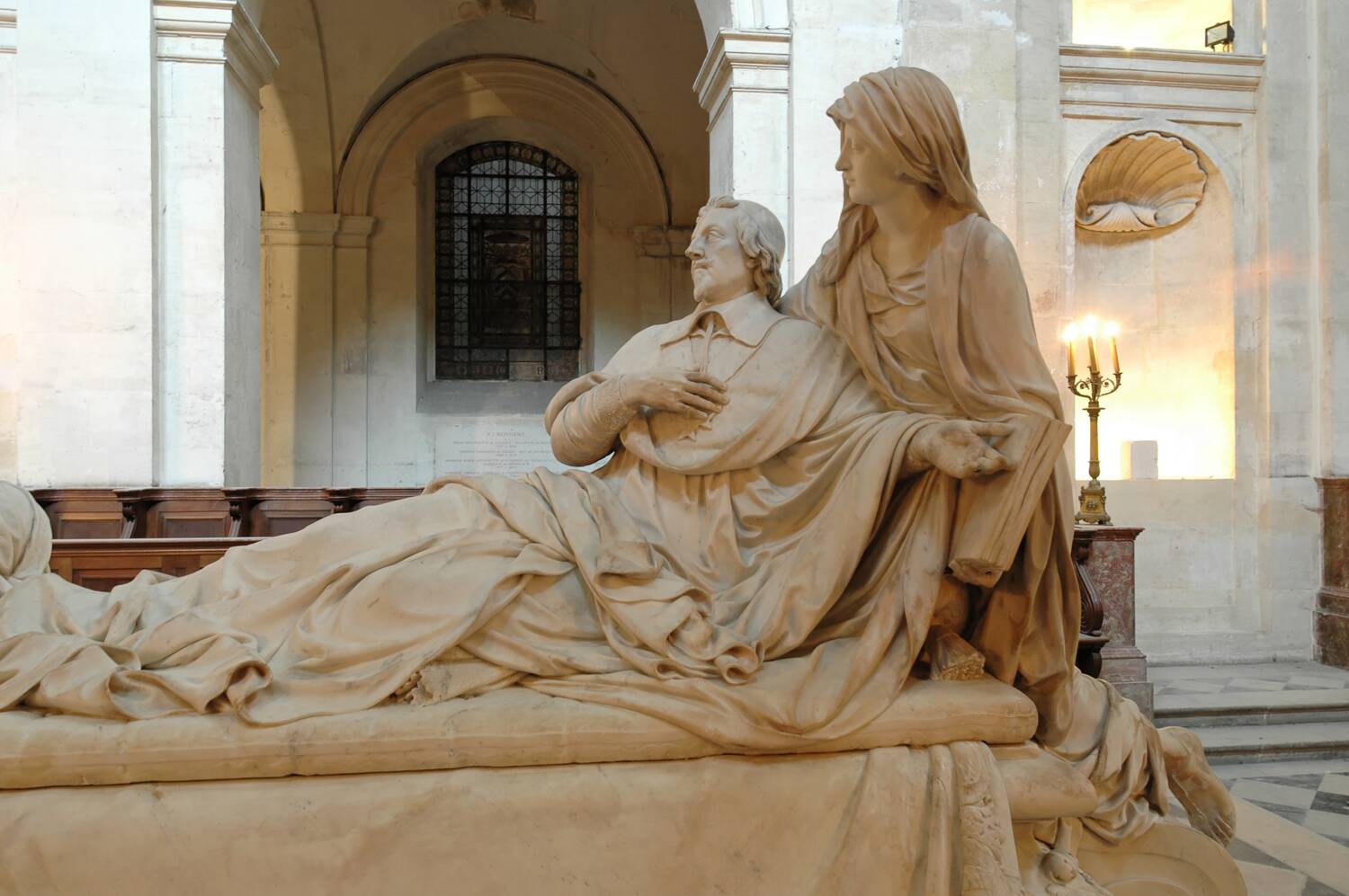 La réalisation du tombeau a fait long feu et il a été achevé près de 40 ans après la mort du Cardinal. Il a été sculpté par François Girardon (1628-1715), premier sculpteur du roi Louis XIV. Très apprécié à la cour, il est l’auteur de quelques-uns des plus grands chefs-d’œuvre de la sculpture versaillaise ou bien encore de la statue équestre du roi qui était située sur l’actuelle place Vendôme (fondue en 1792). La qualité de l’exécution, la finesse des drapés, le rendu des expressions sur les visages des allégories de la Foi et de la Théologie ainsi que la beauté du geste d’abandon du Cardinal se tournant vers l’autel, en font un chef d’œuvre de la statuaire française du XVIIe s.