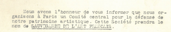 Extrait de la communication annonçant la création du comité central de défense de l’art français.9 décembre 1921 : création de la Sauvegarde