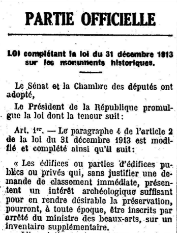 C’est l’aboutissement des premières années de combat de la Sauvegarde. Le duc de Trévise milite activement auprès des députés et sénateurs pour l’adoption d’une loi qui viendrait renforcer la protection des monuments. C’est chose faite avec l’adoption de la loi dite Chastenet, le 23 juillet 1927, qui renforce considérablement la protection des édifices en instaurant un second niveau de protection avec l’inscription à l’Inventaire supplémentaire des Monuments Historiques.