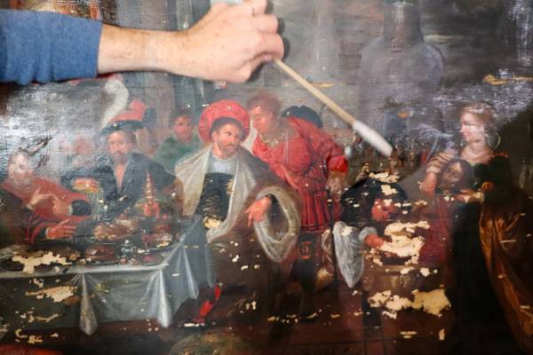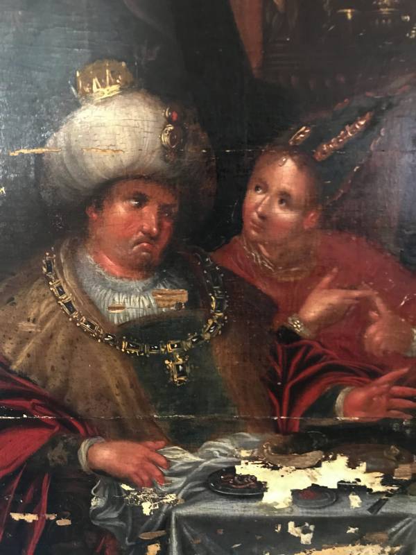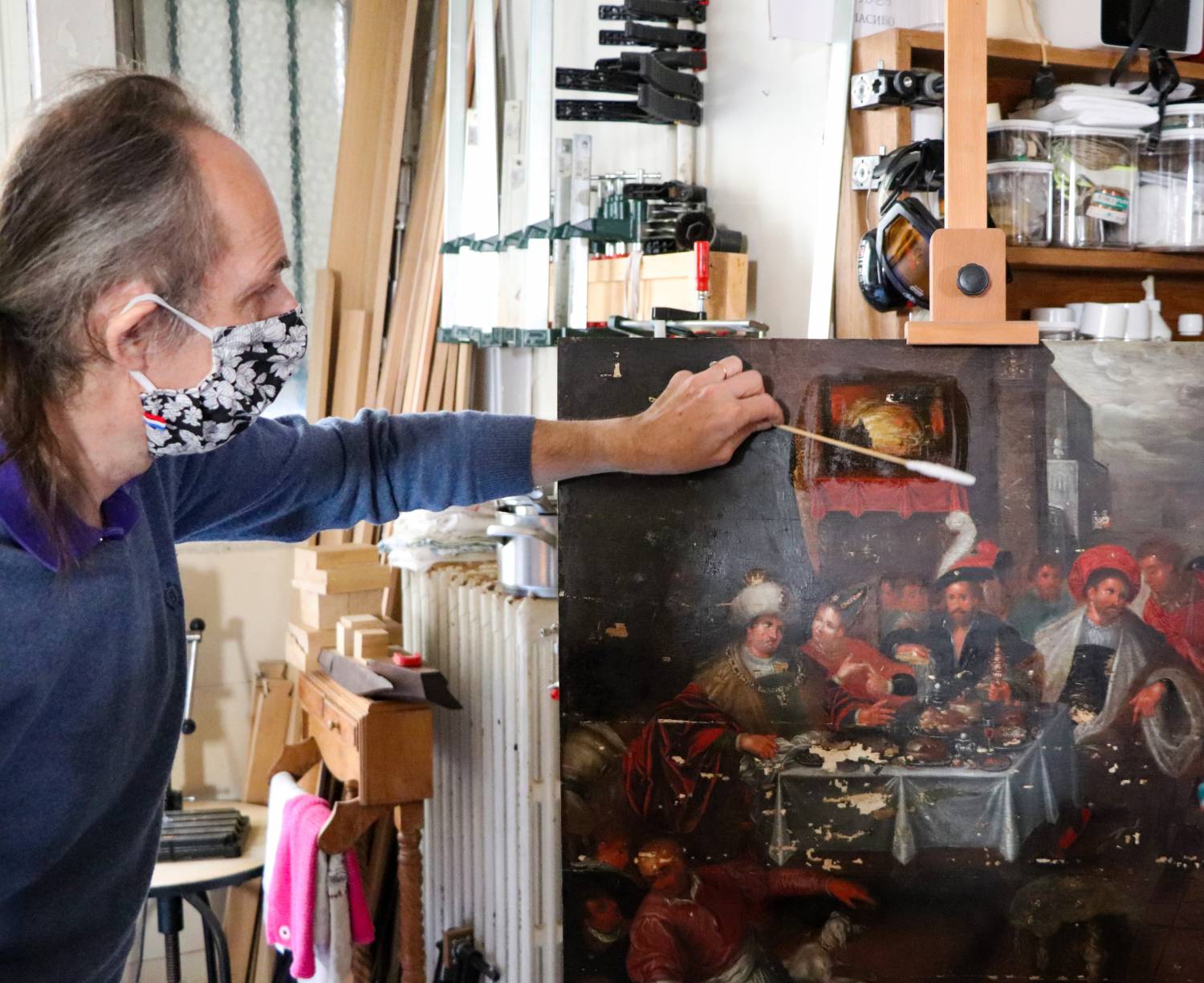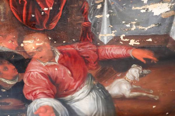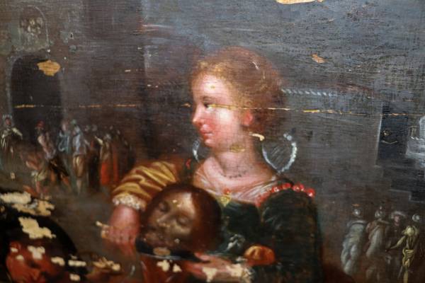 Début septembre, les équipes de la Sauvegarde accompagnées de Madame Irène Jourd’heuil, Conservatrice Régional des Monuments Historiques, et Monsieur Philippe Bardelot, Conservateur d’Antiquités et d’Objets d’Art du Cher, ont visité l’atelier de Monsieur Yves Crinel pour suivre la restauration du Festin d’Hérode, tableau appartenant à la commune d’Etrechy (Cher).