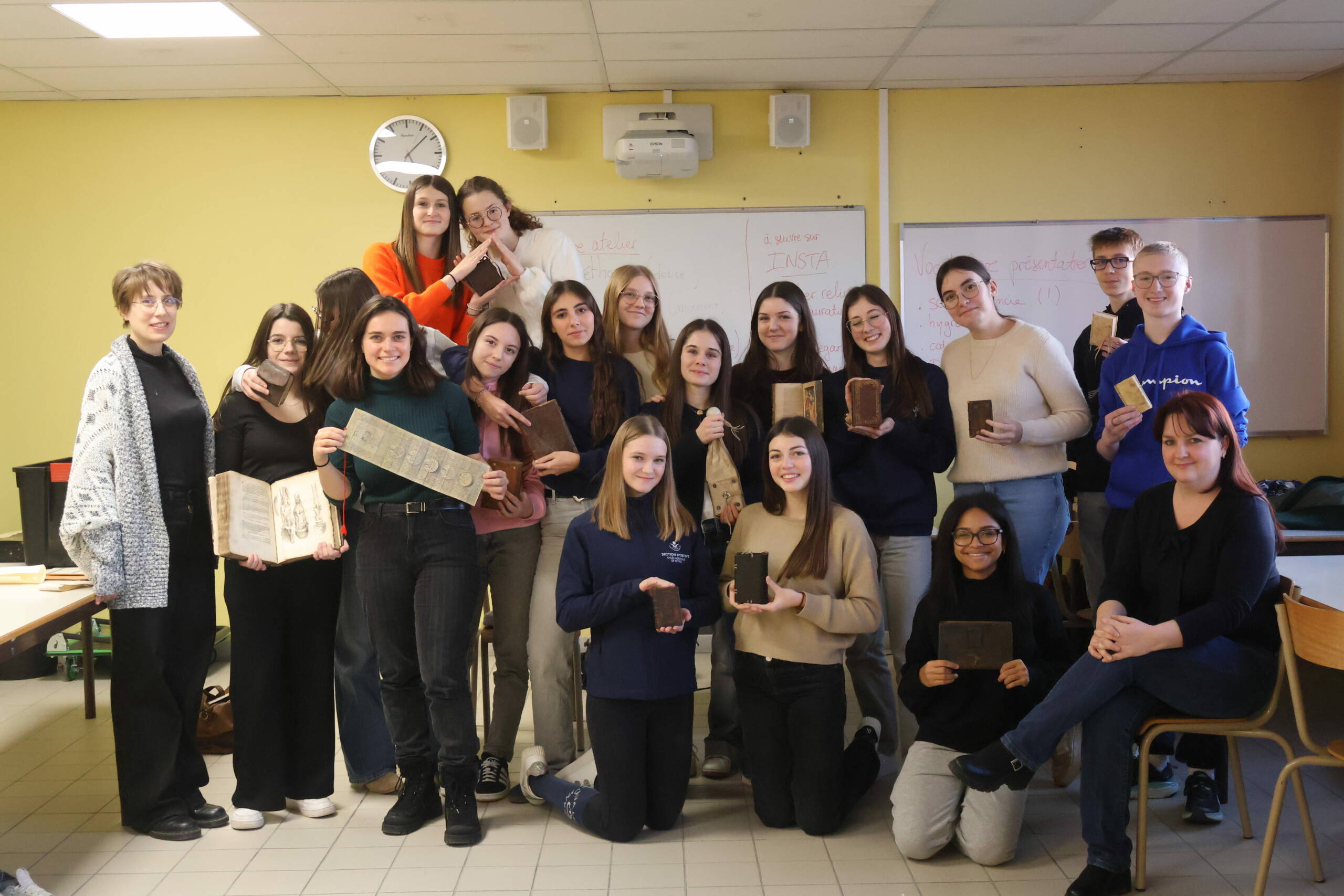 Au lycée agricole de Rethel, c’est une classe de Seconde générale en grande majorité féminine (2 garçons sur 21 élèves !) qui découvre aujourd’hui un volet moins connu de notre patrimoine : le patrimoine écrit. Morgane Pieters, restauratrice de livres anciens et documents graphiques basée à Charleville-Mézières, commence par définir les différentes formes de patrimoine écrit et ses évolutions au cours de l’histoire, du papyrus à la pochette de vinyle en passant par le codex ou l’affiche publicitaire. Les élèves se font passer des livres anciens reliés de cuir issus de la collection personnelle de la restauratrice – notamment ce traité d’un maréchal-ferrant datant du XVIIIᵉ siècle, qui tombe à pic face à des lycéennes pour la plupart en option hippologie-équitation.