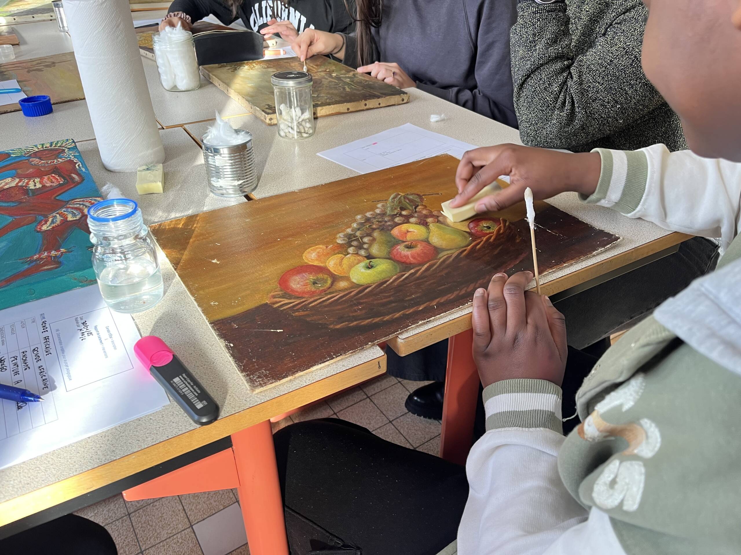 Au lycée Elsa Triolet à Lucé, apprentissage de la restauration de sculptures avec Agathe HouvetÀ DIJON ET AHUN, DÉCRASSAGE & PAPIER JAPON SUR DES TABLEAUX DE BROCANTE