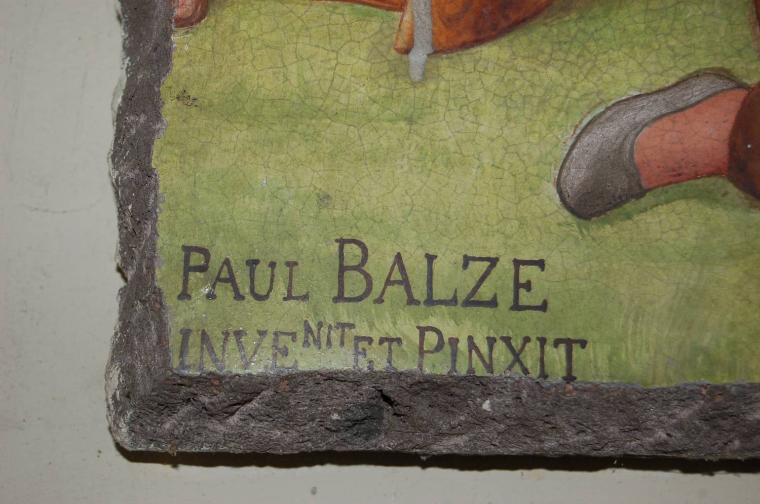 Élève d’Ingres, Paul Balze entre aux Beaux-Arts en 1830, puis se rend à Rome avec son frère Raymond afin de réaliser des copies des œuvres de Raphaël. Celles-ci sont reproduites sur faïence et servent à décorer la galerie du premier étage du Palais des études. Les frères Balze réalisent par la suite plusieurs œuvres pour des commanditaires prestigieux, entre autres le Couronnement de la Vierge pour la voûte du chœur de l’église Saint-Symphorien de Versailles, ou encore La Vision d’Ezéchiel pour l’église Saint-Jacques de Montauban. C’est aussi en Italie que Paul Balze constate la fragilité des fresques qu’il copie et se met en quête d’un support robuste pour ses œuvres. Il le trouve sur des plaques de basalte émaillées. Le procédé impressionne par sa grande résistance et est sublimé par l’art de Balze. L’artiste remporte ainsi plusieurs commandes d’envergure auprès des ecclésiastes parisiens et se fait reconnaître pour la précision et la beauté de ses réalisations sur un matériau aussi brut. Ses réalisations sont encore visibles à Paris, à l’église Saint-Vincent-de-Paul, sur le tympan de l’église Saint-Laurent dans le 10ème arrondissement, ou encore dans l’église de la Sainte-Trinité dans le 9ème arrondissement.
