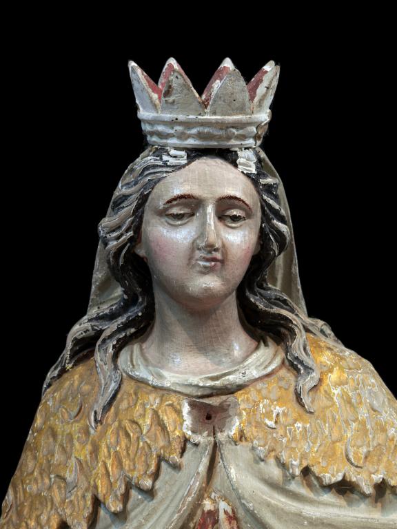 Très peu d’informations nous sont parvenues sur l’historique de cette oeuvre, d’autant qu’elle ne comporte aucune inscription ou signature. Cette statue, qui rappelle certaines œuvres du XVIIème siècle par la taille de la couronne et la forme du surcot, pourrait néanmoins avoir été réalisée vers le milieu du XIXème siècle, avant que la statuaire de terre cuite, puis de plâtre, ne succède à la statuaire de bois dans les églises. Elle provient donc probablement de la précédente église de Cardonnette, l’actuel édifice ayant été bâti à partir de 1893.