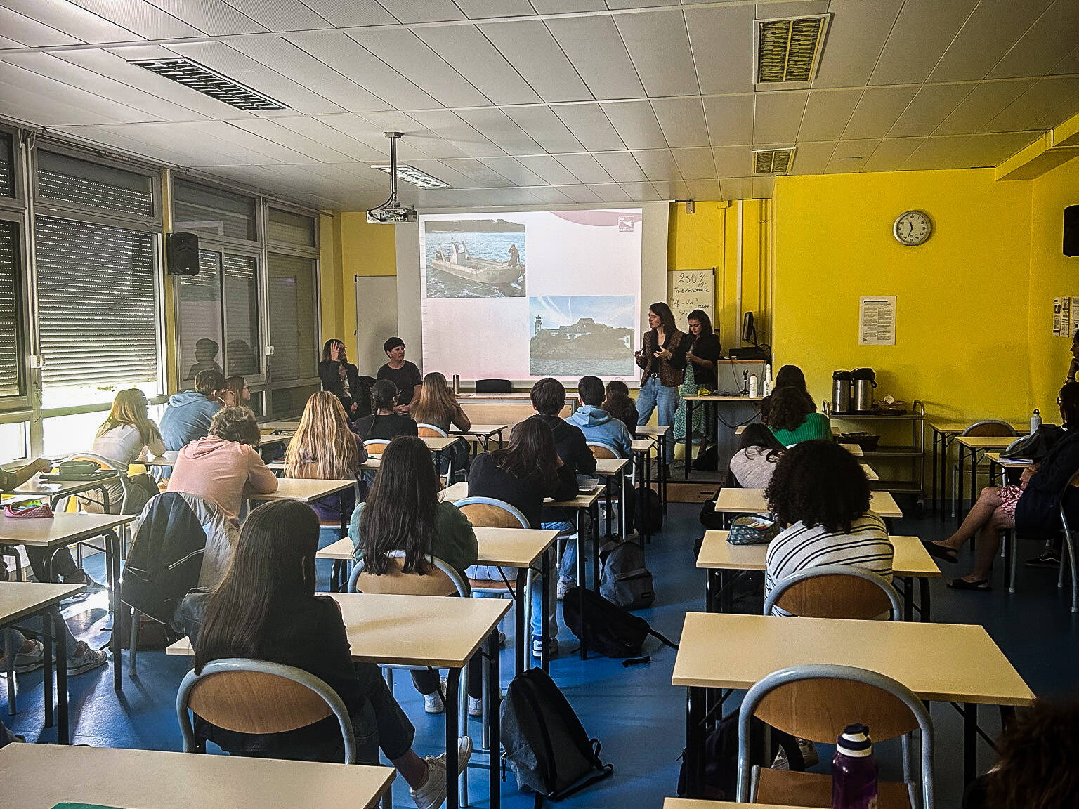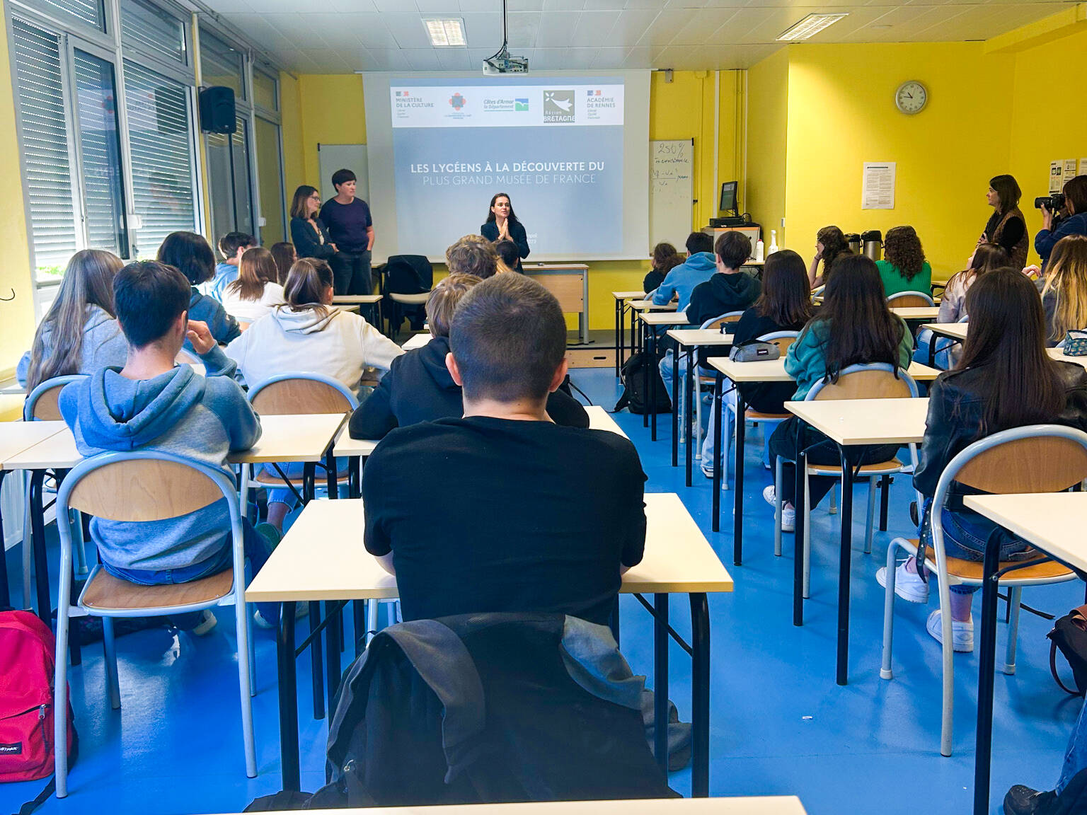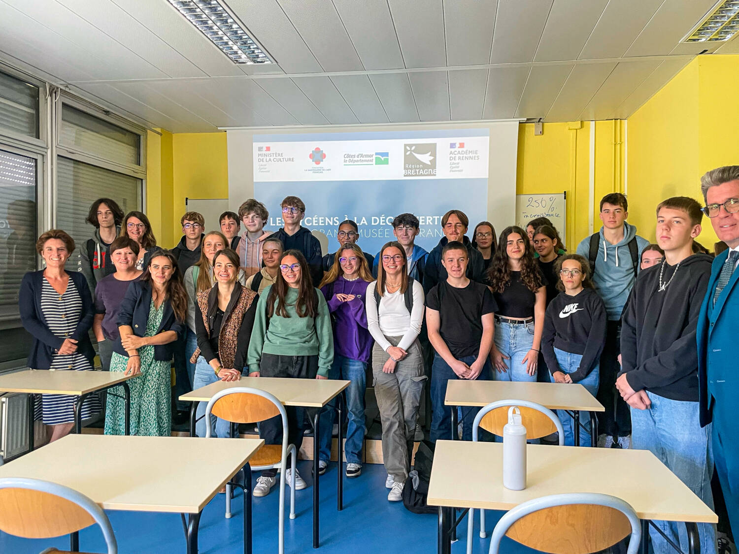 La classe de Seconde et les équipes du projet au lycée Kerraoul de Paimpol lors du lancement, le mardi 10 octobre. Au lycée KerrAoul de Paimpol, les acteurs du projet présentent leurs métiers et les œuvres à sauver