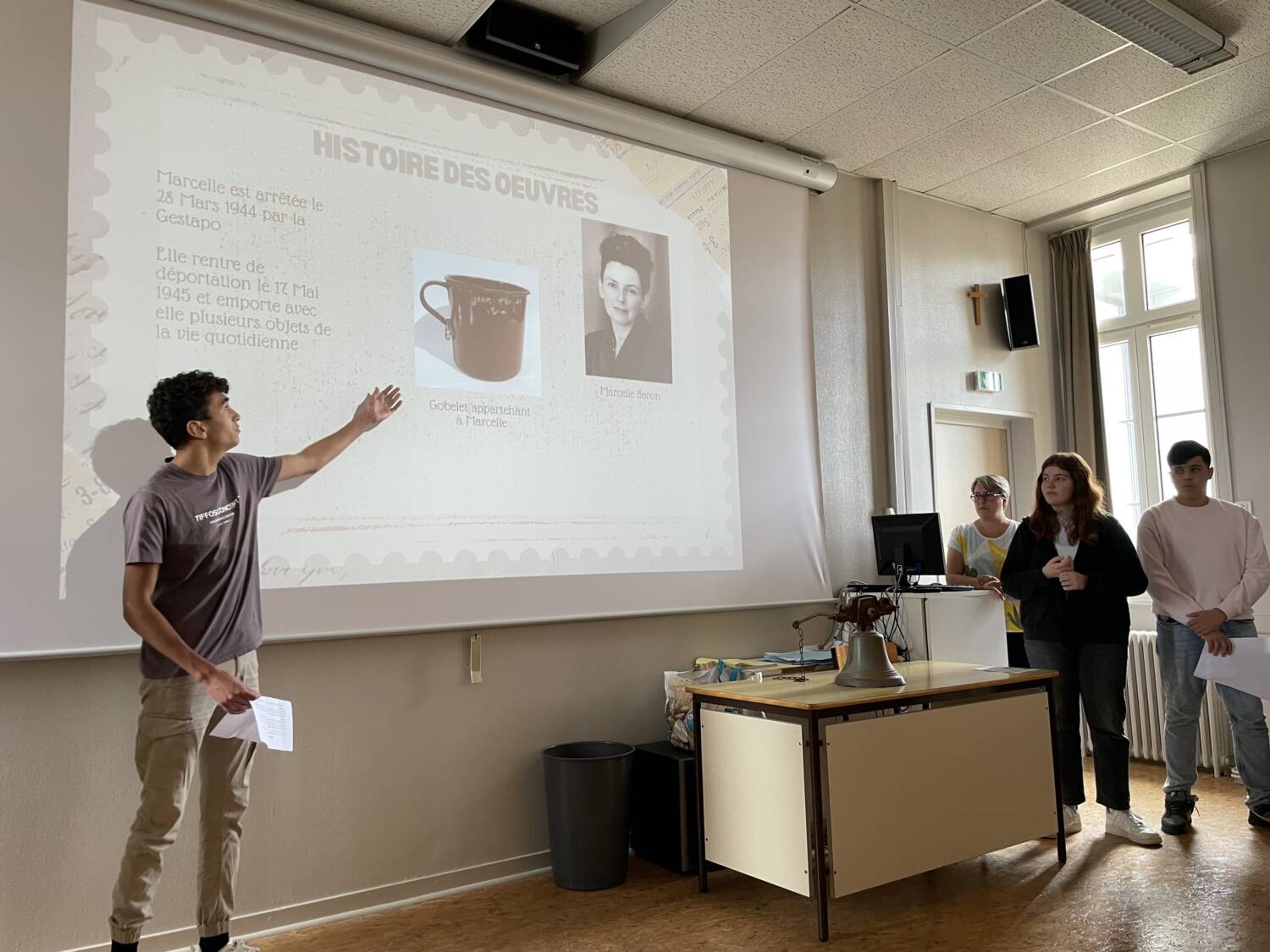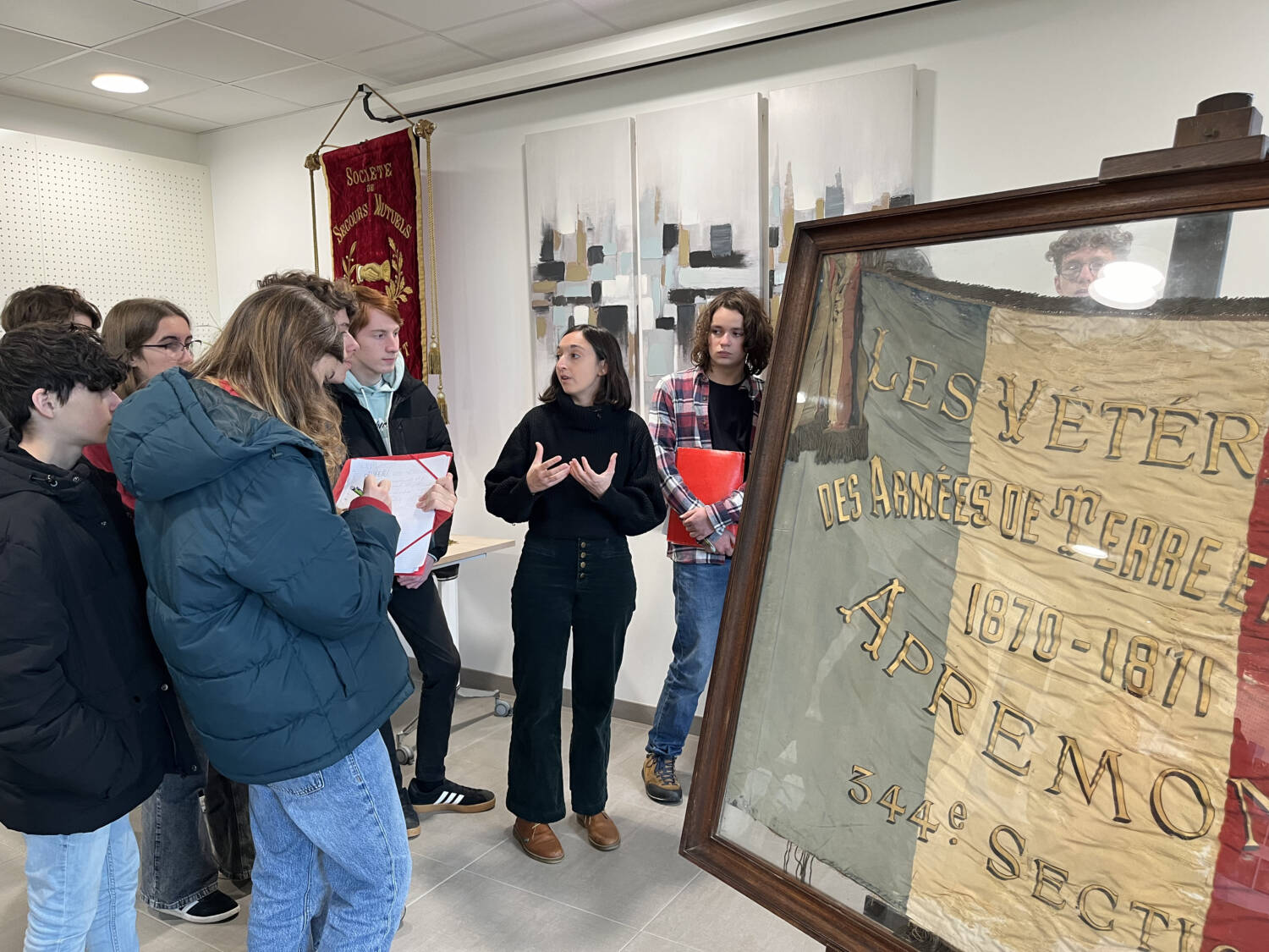 Claire Durand, conservatrice déléguée des antiquités et objets d’art en Vendée, présente à des élèves du lycée Colette Le Bret un rare drapeau des anciens combattants de 1870, conservé à la mairie d’Apremont (85)Les élèves découvrent ensuite les oeuvres in situ lors d’une journée de visite, rencontrent les élus et associations locales qui œuvrent à leur sauvegarde et recueillent les explications des conservateurs sur ces oeuvres : histoire, iconographie, besoins de restauration… Ils font en classe des recherches complémentaires sur ces œuvres et s’initient avec leurs professeurs à l’histoire de l’art et aux multiples enjeux de conservation-restauration du patrimoine public.