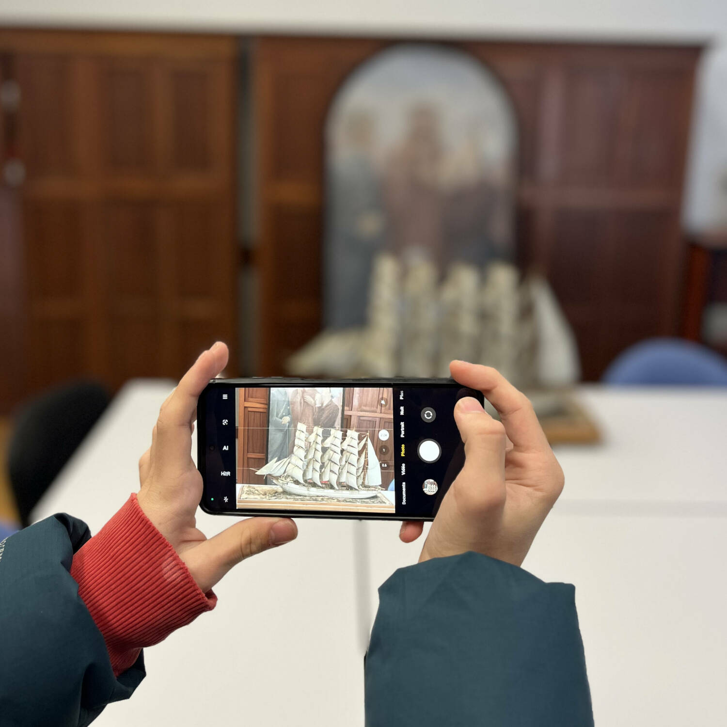 Un élève prend en photo une maquette de bateau dans la mairie de Saint-Gilles-Croix-de-Vie (85)En fin de semestre, lors d’un concours d’éloquence, ils défendent chaque œuvre, débattent entre eux et choisissent par vote (seuls les lycéens ont le droit de vote !) celle qui recevra un don de 10 000€ mis en jeu par la Région Pays de la Loire afin de financer sa restauration.