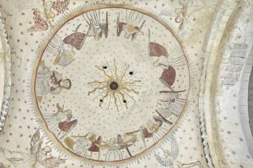 Peinture de l’un des plafonds du château de la Jaubertie à Colombier (24) – Alain BéguerieLes autres sites bénéficient d’une notice aussi complète que possible en fonction de l’état des peintures et des études réalisées. Les peintures retracent dans ces églises périgourdines de nombreux épisodes du Nouveau Testament. Les scènes profanes ne sont pas en reste. Enfin, des armoiries familiales ou encore des trompe-l’œil dans des demeures d’agrément sont à dénombrer dans cet immense patrimoine mural périgourdin. Avec des bornes chronologiques allant du Xe au XXe siècle, cet ouvrage ne néglige pas les œuvres plus contemporaines comme celles figurant dans l’école d’Atur.