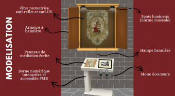 L’équipe proposait en projet de valorisation de créer un ensemble de médiation comprenant une vitre de protection pour la bannière, un éclairage adapté et surtout une borne numérique interactive, pensée pour les personnes à mobilité réduite et munie d’écouteurs permettant d’en apprendre plus sur l’œuvre, son histoire et sa restauration via une application dédiée.