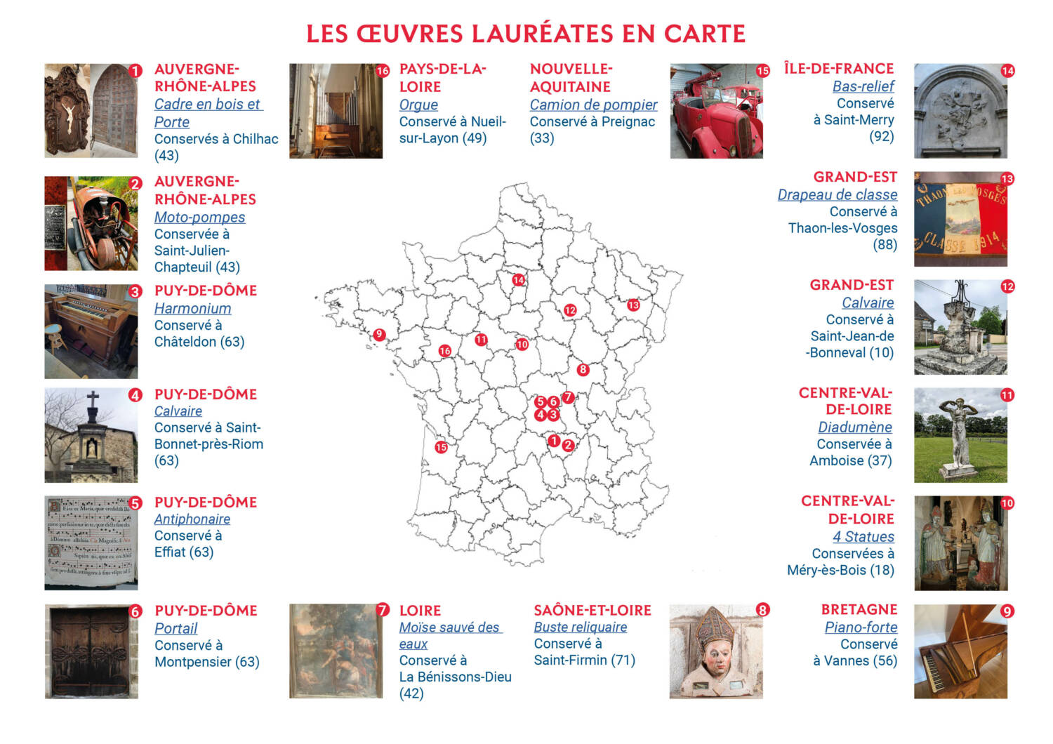 Le 28 juin, la dernière étape du programme a permis d’élire seize œuvres, propriétés de municipalités et d’associations, qui bénéficieront chacune d’un don de 8 000€ de la Fondation d’Entreprise Michelin pour leur restauration. Grande nouveauté cette année : afin de récompenser la forte mobilisation du site de Blavozy tout au long de la campagne, l’œuvre arrivée en deuxième position pour ce site pourra également bénéficier d’un don pour sa restauration.