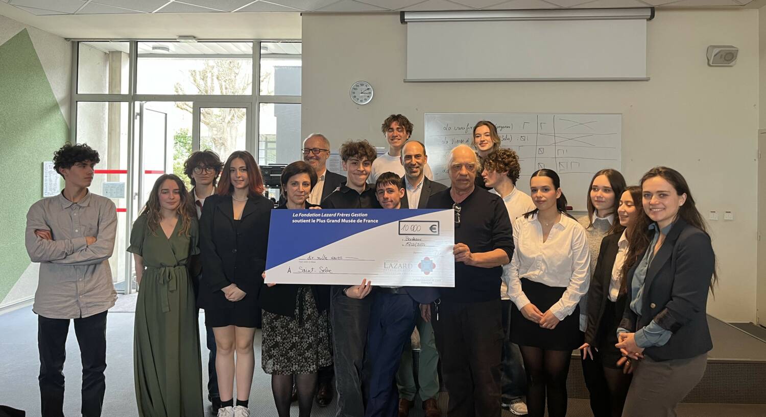 Les élèves de Saint-Vincent-de-Paul à Bordeaux remettent le chèque à la commune de Saint-Selve © La Sauvegarde de l’Art FrançaisÀ Bordeaux, l’oeuvre donnée perdante remporte le vote