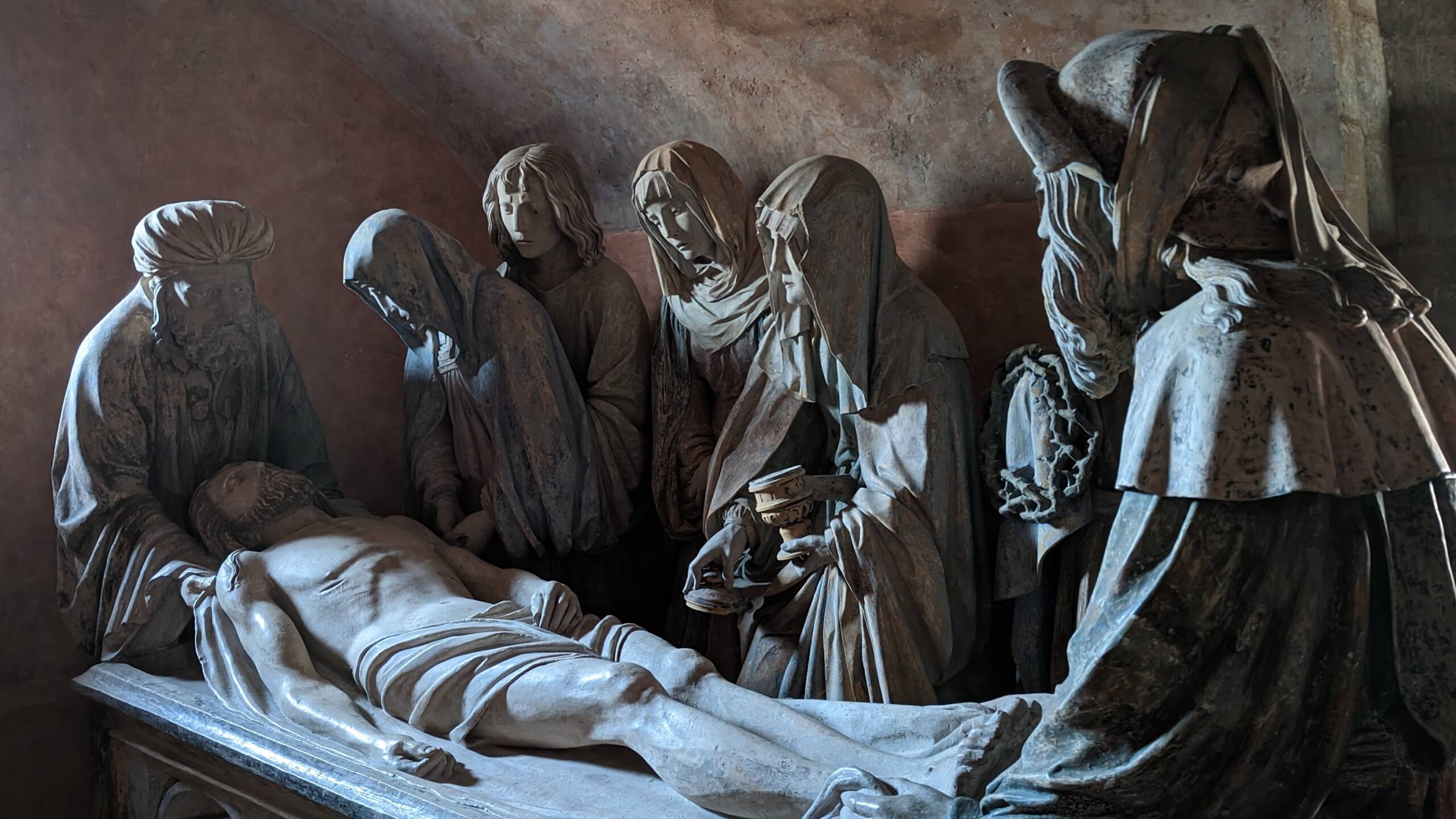 La Mise au tombeau, groupe sculpté, église Saint-Jean-Baptiste de Chaource (10)Située dans la crypte semi-enterrée de l’église de Chaource, la Mise au tombeau (1515) est une sculpture monumentale des plus remarquables de l’Europe du XVᵉ siècle. Ce chef-d’œuvre prend place dans un espace intime, où l’entrée basse invite le visiteur à se courber avant de découvrir les riches peintures murales qui enrichissent la scène.