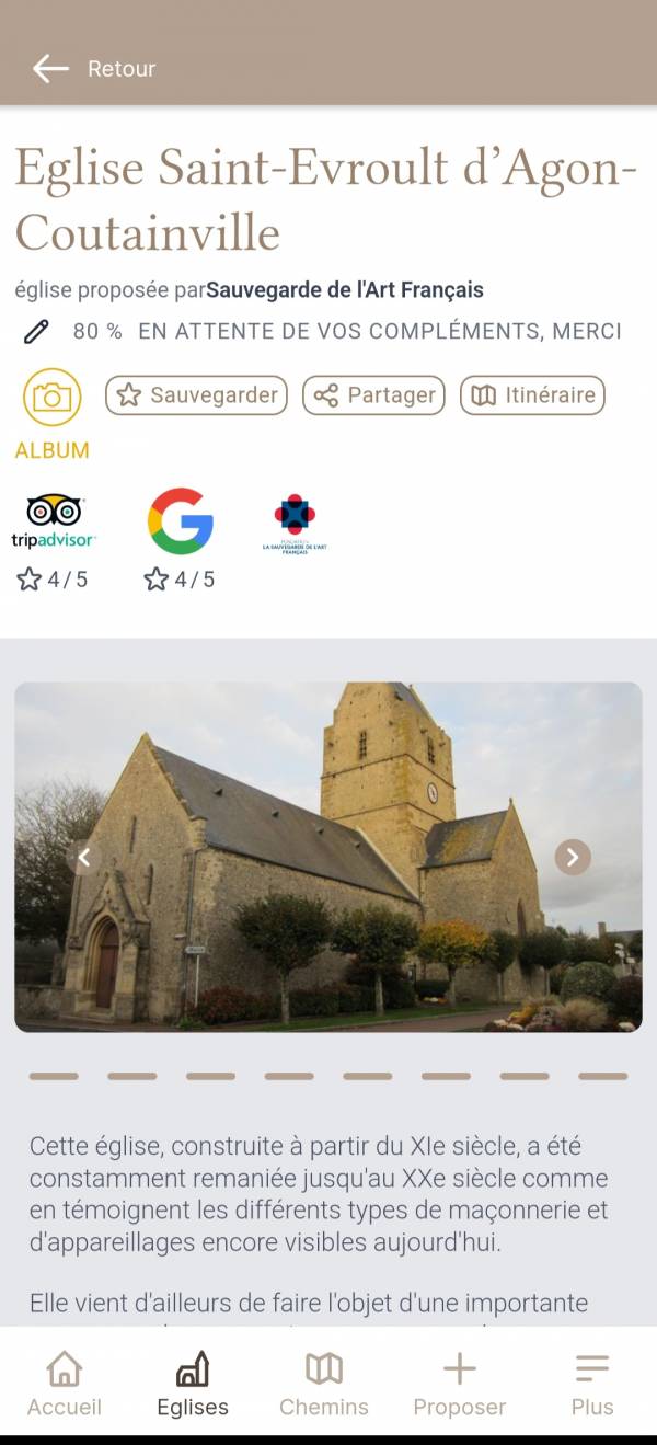 Présentation de l’application BellesEglisesBellesEglises a ainsi lancé il y a trois ans une application gratuite, accessible sur les plateformes de téléchargement de tous les smartphones. L’application propose déjà la découverte et la visite de 400 édifices religieux en France.