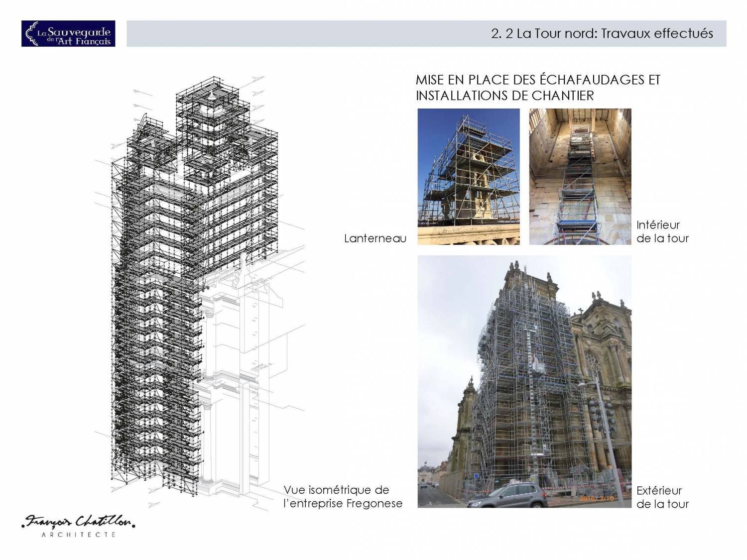 La tranche ferme, qui s’est terminée en février 2017 concernait la restauration de la tour nord du massif occidental ; la tranche en cours implique la tour sud et la troisième tranche la partie centrale de la façade occidentale.