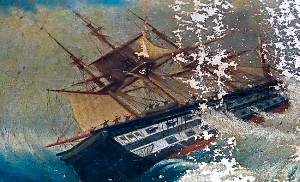 Naufrage d’une embarcation du navire Algésiras, toile du XIXe siècle par Joseph Lemoine conservée à L’île-aux-Marins, Saint-Pierre-et-Miquelon (975).