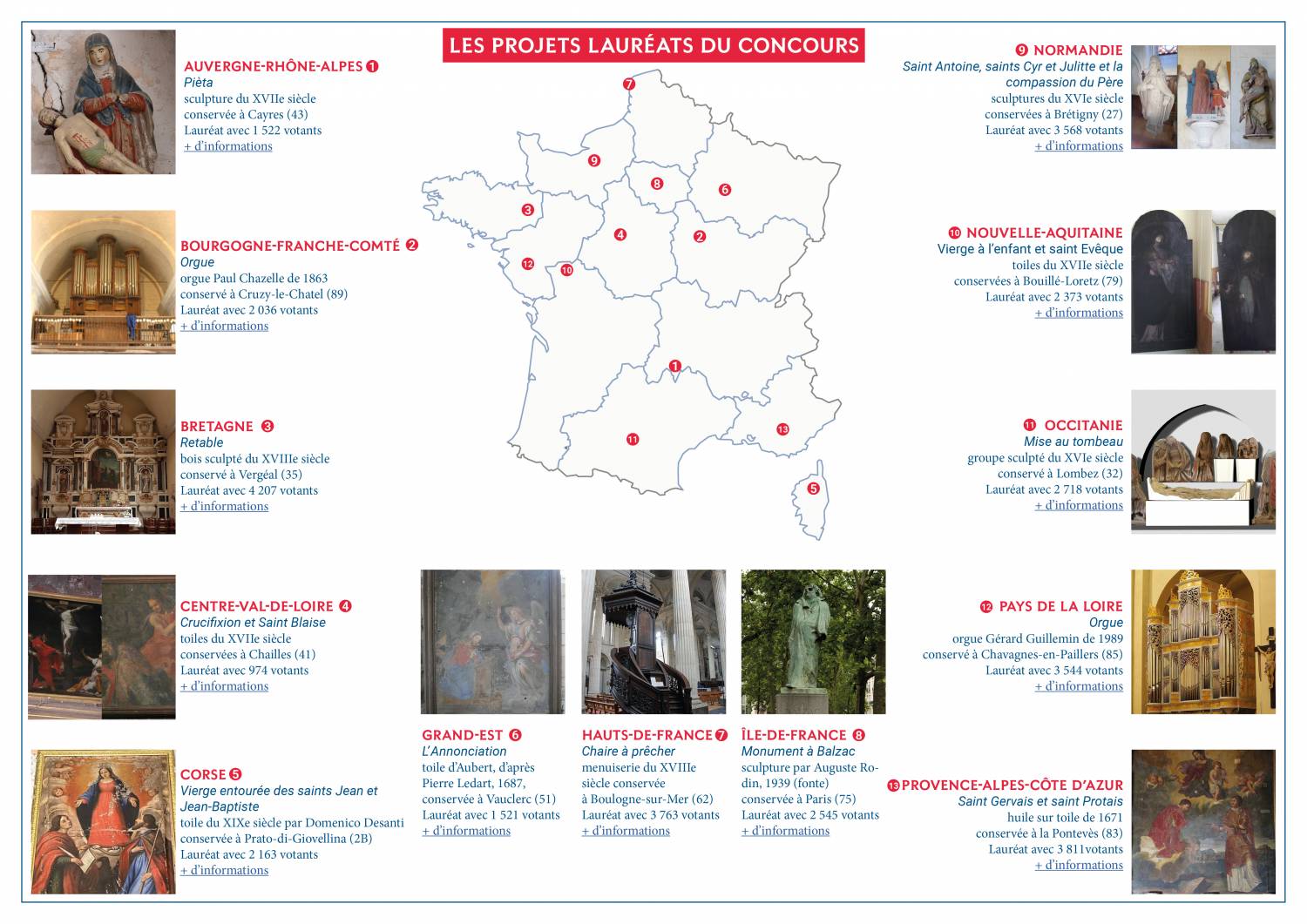 Chaque œuvre lauréate va ainsi recevoir 8 000€ de mécénat de la part d’Allianz France afin d’engager les travaux de restauration. La carte ci-après détaille les résultats du concours par région.