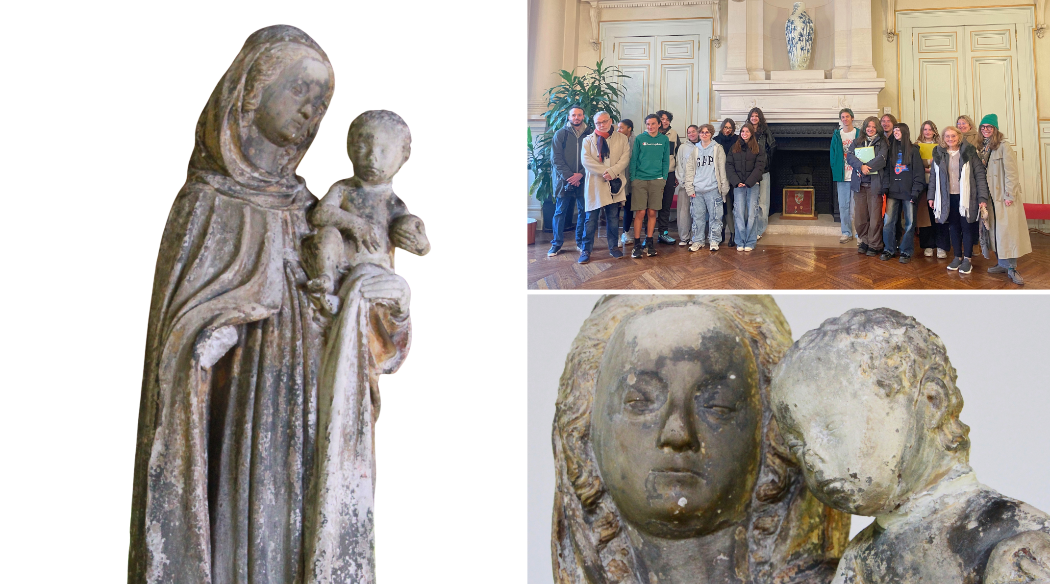 « Nous avons eu une journée de visite à Évreux avec des élèves du micro-lycée (des élèves en situation de décrochage scolaire ou rencontrant des problèmes de santé). Ils se sont montrés très intéressés et curieux. Nous avons découvert une Vierge à l’Enfant, que nous avons trouvée particulièrement belle. Il s’en dégageait une immense douceur, et elle nous a profondément bouleversés. La statue, très encrassée, a malheureusement été malmenée : les têtes de l’Enfant et de la Vierge ont été maladroitement recollées, le nez de l’Enfant est cassé, certains doigts de pied manquent, tout comme le bras droit de la Vierge. Cette statue d’apparence simple nous a touchés en plein cœur. »