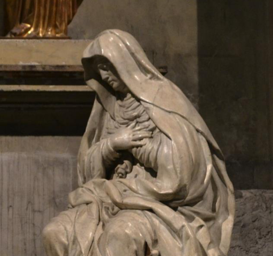 Pieds nus, assise sur un rocher, la tête couverte par un pan de l’ample manteau qui l’enveloppe tout entière, la Vierge incline son visage émacié, étroitement enserré par une guimpe, et croise sur sa poitrine ses longues mains dont les doigts effilés se crispent douloureusement.