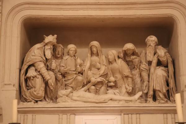 Ici l’œuvre à restaurer est une vierge de pitié du XVIe accompagnée d’un bas-relief présentant les Apôtres, sans doute placés sur la façade de l’église au XIXe siècle. Fabienne Audebrand n’a pas de difficulté a expliquer pourquoi une restauration s’impose : le climat et le temps ont à l’évidence grandement altéré leur qualité.