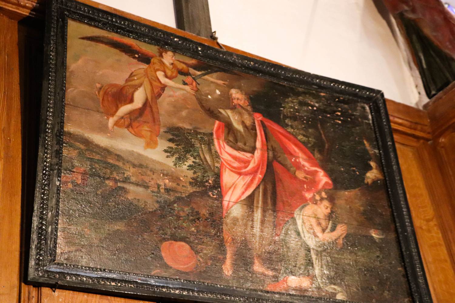Fabienne Audebrand décrit l’édifice, son architecture et son mobilier avant de parler la première oeuvre de la journée : une huile sur bois du XVIIe siècle, Le Sacrifice d’Isaac. Le tableau est d’une grande qualité et les élèves prennent des notes avec soin pour relever toutes les spécificités de cette peinture. Elles leur serviront à travailler sur l’œuvre et sa riche iconographie en classe.