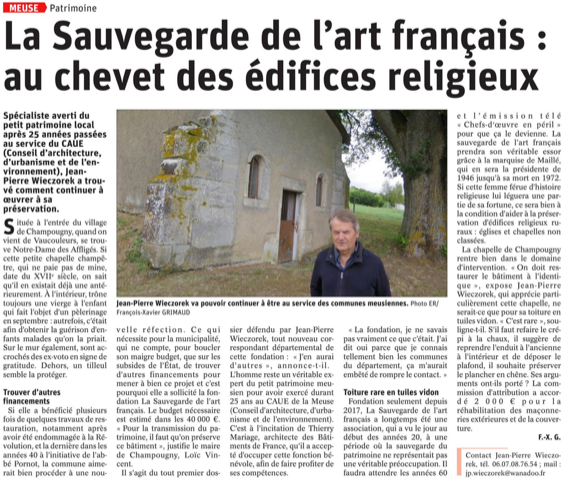 | L’Est Républicain relaie l’action des correspondants de la Sauvegarde | Jean-Pierre Wieczorek, nouveau correspondant de la Sauvegarde de l’Art Français pour la Meuse, a donné une interview pour le journal L’Est Républicain.