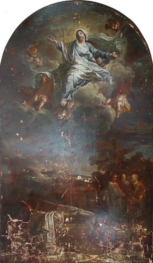 L’œuvre était fortement abîmée et encrassée, présentait des lacunes et des moisissures. Le vernis devait être remplacé. Grâce à un mécénat particulier, l’œuvres a pu être restaurée. La toile a été dépoussiérée, et un traitement antifongique lui a été appliqué. La couche picturale, qui ne présentait pas de décollement, a été nettoyée, dévernie, ses lacunes mastiquées et retouchées, puis de nouveau vernie. L’œuvre a pu retrouver son éclat d’antan.