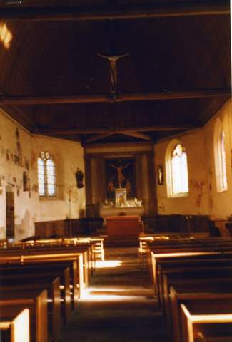 À l’intérieur, on note le changement de parti dans les murs et sur la charpente de l’édifice. Le vaisseau unique est couvert d’une charpente lambrissée à voliges jointives et couvre-joints régulièrement espacés, la demi-enrayure de l’abside porte la date de 1788. La charpente apparente possède entraits et poinçons bagués à profil prismatique, amortissements en flacons et sablière moulurés, ainsi que des blochets sculptés au raccord de charpente. La poutre de gloire porte un Christ en croix et une sainte Madeleine à ses pieds ; les deux sont polychromes.