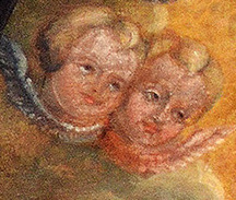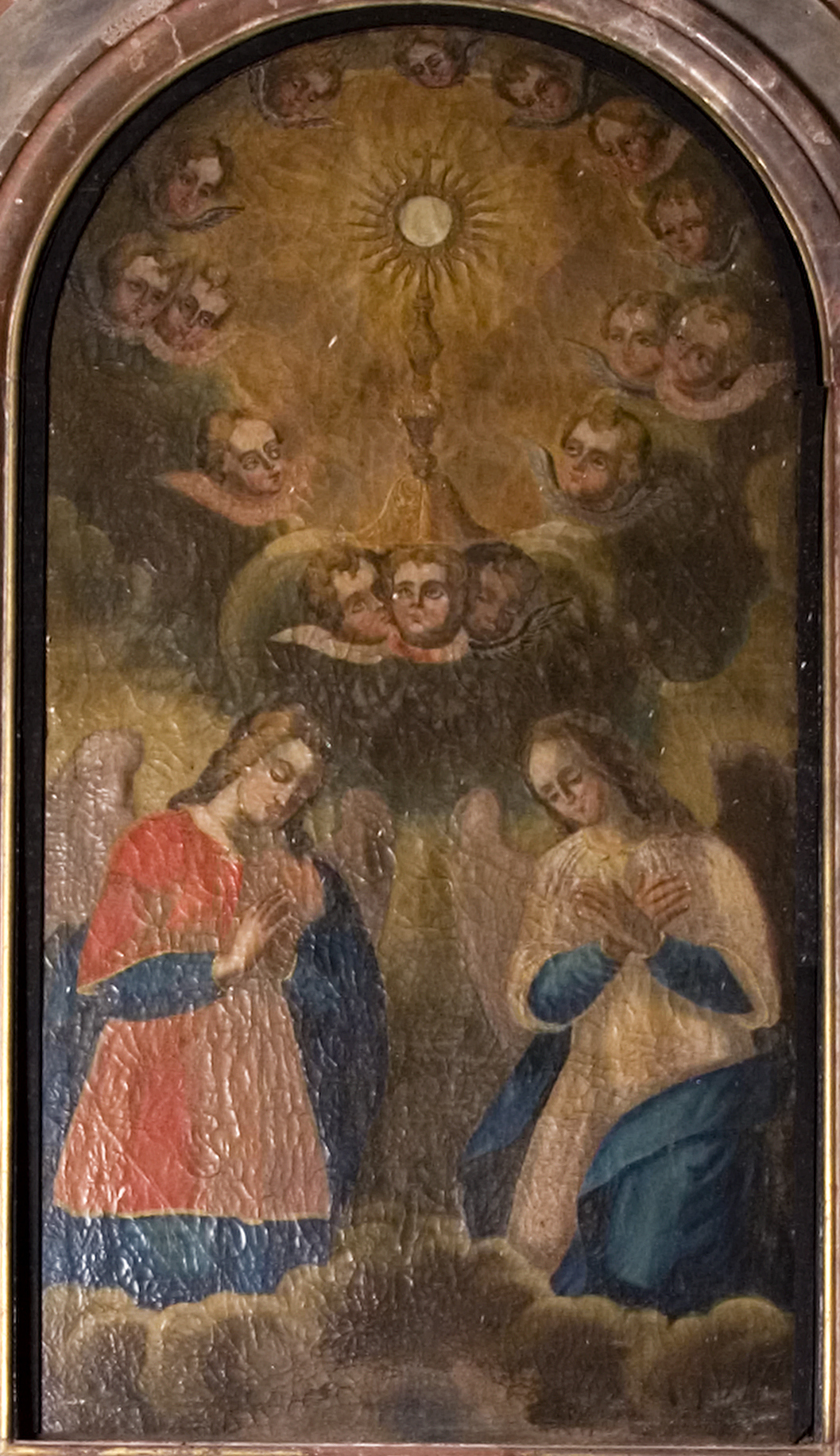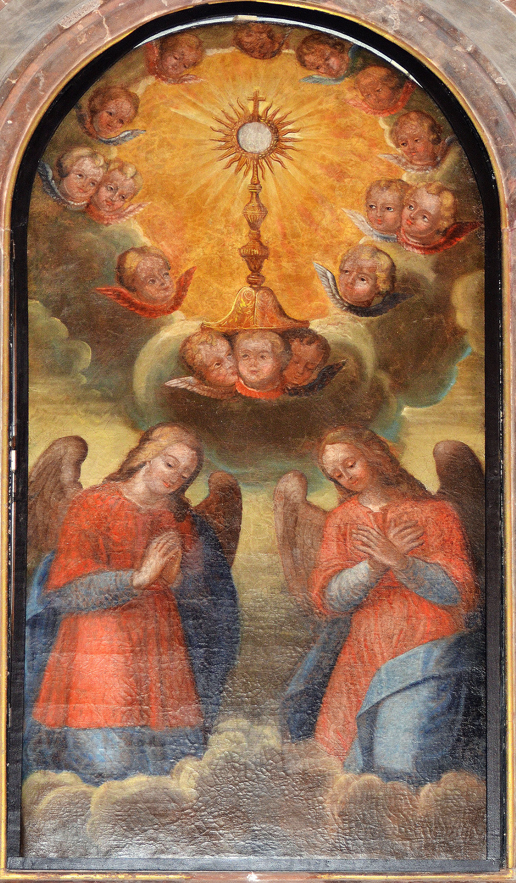 La moitié inférieure est occupée par deux anges recueillis, agenouillés, portés par des nuages. L’ange placé à gauche, mains jointes, est vêtu d’un vêtement rouge avec liseré d’or, recouvert d’un ample manteau bleu. L’ange placé à droite, croise ses mains sur sa poitrine. Il porte un manteau similaire à celui de l’autre ange, mais sur un vêtement blanc avec liseré d’or. Au-dessus des anges, un groupe de trois angelots se détache sur un large cœur soutenant un ostensoir ouvragé. La partie supérieure de la composition s’inscrit parfaitement dans la forme arrondie de l’œuvre. Une douzaine d’angelots dans les nuées, encerclent l’ostensoir à rayons, finement ciselé.