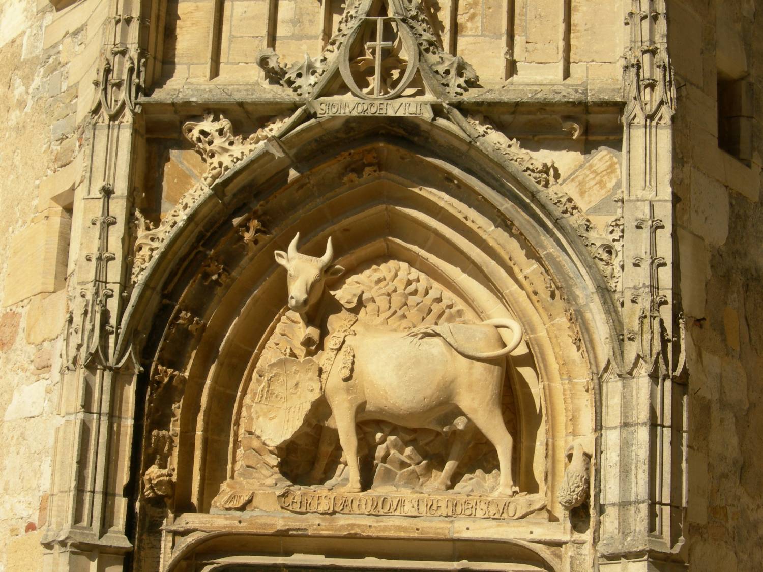 M. Daure lui expliquait alors comment, en 1912, la vache qui orne le portail sculpté du XVe siècle, avait été sauvée par les alanais qui avaient accouru, en pleine nuit, au son des cloches de l’église Notre-Dame, pour s’opposer à son enlèvement par un marchand qui en avait déjà prévu la revente.