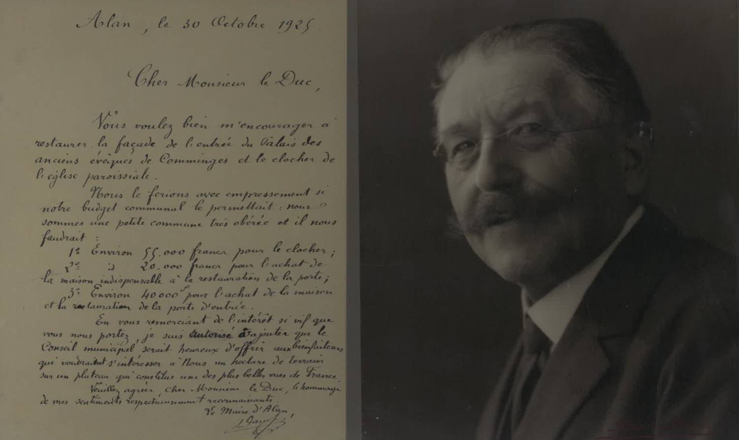 Lettre du 30 octobre 1925, adressée au duc de Trévise, par M. Daure, maire d’Alan, pour solliciter l’aide de la Sauvegarde.