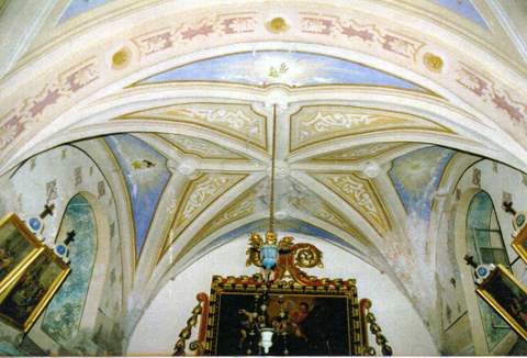 À l’intérieur, les peintures des voûtes et les motifs au pochoir des murs gouttereaux ont été repris aux XIXe et XXe s., pour remédier aux dégradations climatiques. En revanche, tout un ensemble mobilier des XVIIe et XVIIIe s. est conservé : peintures sur toile dans leur cadre de bois doré comme la Vierge à l’Enfant endormi du retable, divers ex-votos, sculptures, coffres où les fidèles déposaient le seigle vendu pour l’entretien de la chapelle.
