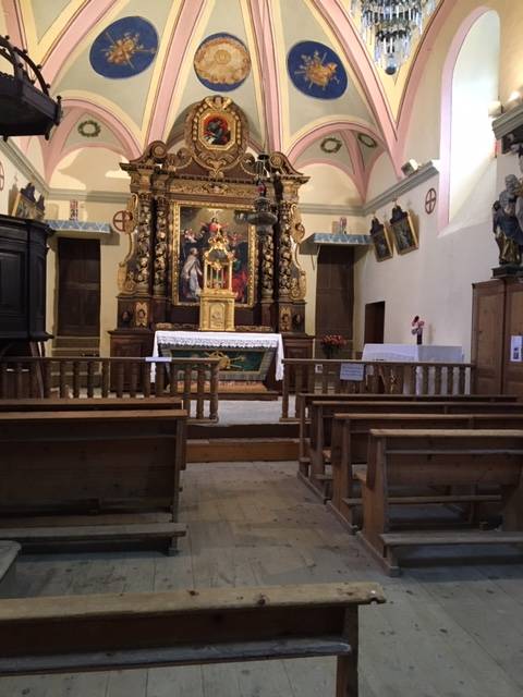 Au XVIIème s., la plupart des villages de Tarentaise et de Maurienne ont rebâti leurs églises, les constructions antérieures n’ayant pas résisté aux rigueurs des hivers ou aux nombreuses guerres qui ont ravagé ces vallées. L’église paroissiale Saint-Nicolas est un bon exemple de ces simples églises ou chapelles de montagne dont le volume se confond avec celui des maisons du village. C’est un simple rectangle de 28 m sur 8,75 m sans décor, à l’exception du portail ouest en tuf « bien taillé » d’après l’accord passé avec le maître-maçon Anthoine Pich, du Val Sesia, le 9 juin 1674 par les « communiers » de Montrond. Les murs devaient être terminés pour la fin de 1675. Cependant, ce n’est que le 5 juillet 1677 que l’église sera consacrée par MB Berzet, évêque de Maurienne. La réalisation du riche décor peint du chœur, heureusement conservé, s’est prolongée encore pendant quelques années. Le maître-autel et son retable (actuellement en instance de classement) ont été commandés en 1688 à Claude Borrelin de Saint-André et à Jean Symond de Bramans qui sculptera aussi en 1693 le grand crucifix de la poutre de gloire. Le grand tableau au centre du retable est l’œuvre de Gabriel Dufour de Saint-Michel de Maurienne, peintre de son Altesse Royale Victor-Amédée II. La chaire et la table de communion sont aussi du XVIIème s. ainsi qu’une statue en bois polychrome de saint Bernard de Menthon, une Vierge à l’Enfant en bois doré, plusieurs tableaux dont une Vierge à l’Enfant de Jean-Baptiste Jomard (1689). Ce très bel ensemble est actuellement en danger en raison du très mauvais état de conservation de l’édifice. La petite commune de Montrond (61 habitants) ne disposait que de faibles ressources ; sa réunion en 1972 avec celle d’Albiez-leVieux lui permet d’envisager les travaux nécessaires à la sauvegarde de l’édifice : révision de la toiture en tôle galvanisée, drainage et réfection des enduits. La Sauvegarde de l’Art Français a participé pour 80 000 F aux travaux en 1995. L’église Saint-Nicolas s’intégrera dans le circuit « Les chemins du Baroque » qui comprend dix-sept sites pour la Maurienne et connaît un grand succès.