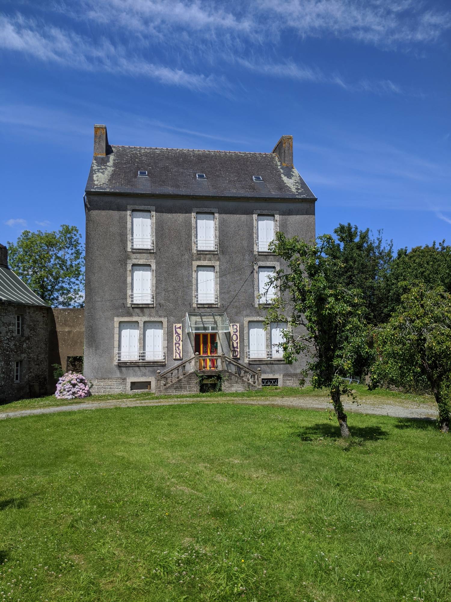 Les menuiseries en bois présentent des petits bois , il n’y a pas trace de contrevents sur cette partie du bâtiment. La toiture est à deux pentes, en ardoises. Une cheminée encadre le bâtiment de chaque côté.