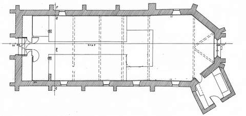 Le plan de l’église se compose d’un vaisseau unique de cinq travées terminé par une abside à trois pans. L’usage de la brique domine dans l’élévation extérieure des murs avec les contreforts talutés et les piédroits des baies simples en arc brisé qui ajourent le vaisseau. Font exception les contreforts plus épais en pierre qui, au sud comme au nord, marquent la limite entre la quatrième et la cinquième travée, de même que la baie d’axe, la seule qui présente un remplage de pierre à trois lancettes, sous un tympan ajouré de trois oculi sur des mouchettes. La présence sous l’appui de cette fenêtre de trois courts contreforts, en pierre également, témoigne peut-être de vestiges d’un édifice plus ancien, qui ne saurait en tout cas, en raison de la relative lourdeur du remplage de la baie, être antérieur au XVIe siècle.