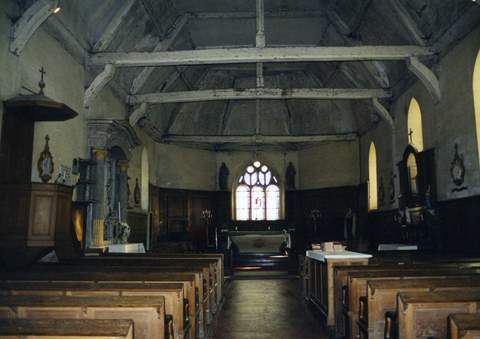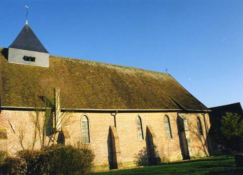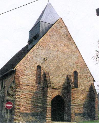 Le vaisseau est couvert d’une charpente lambrissée à entraits, poinçons et faux entraits. L’extrémité des entraits reposant sur les sablières est soulagée par des aisseliers. Un clocher charpenté émerge à peine du toit, à l’extrémité occidentale de la nef. Une triple arcade en supporte le poids à l’intérieur de l’édifice et dégage la partie inférieure de la première travée pour permettre l’accès aux parties orientales. La façade est un simple mur-pignon entièrement en briques, épaulé par quatre profonds contreforts à couronnement taluté. Les deux contreforts médians encadrent le portail en arc brisé. Deux étroites baies aveugles constituent la seule ornementation de la moitié supérieure du pignon.