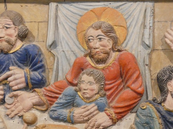 On distingue dans ce brouhaha le geste que fait Jésus vers le personnage assis en face de lui. Il tend vers ce dernier un morceau de pain. Il ne peut s’agir que du traître Judas, qui dissimule d’ailleurs derrière son dos la bourse contenant les trente deniers qui lui ont été offerts pour livrer le Christ.
