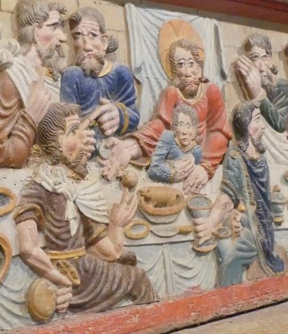 Notre panneau de bois polychrome, sculpté en bas relief, est placé au dessus de l’autel. Au centre de la composition, on reconnait Jésus, de rouge vêtu, avec son nimbe. Jean, selon l’iconographie classique, s’est glissé entre ses bras. On sent une grande agitation autour de cette table, les disciples, discutent, se disputent même et l’artiste a su rendre compte du mouvement en accentuant notamment la taille des mains. Cette agitation est causée par l’annonce que vient de faire le Christ : l’un d’entre eux va le trahir. Les apôtres témoignent donc leur stupéfaction et cherchent à prouver leur innocence.