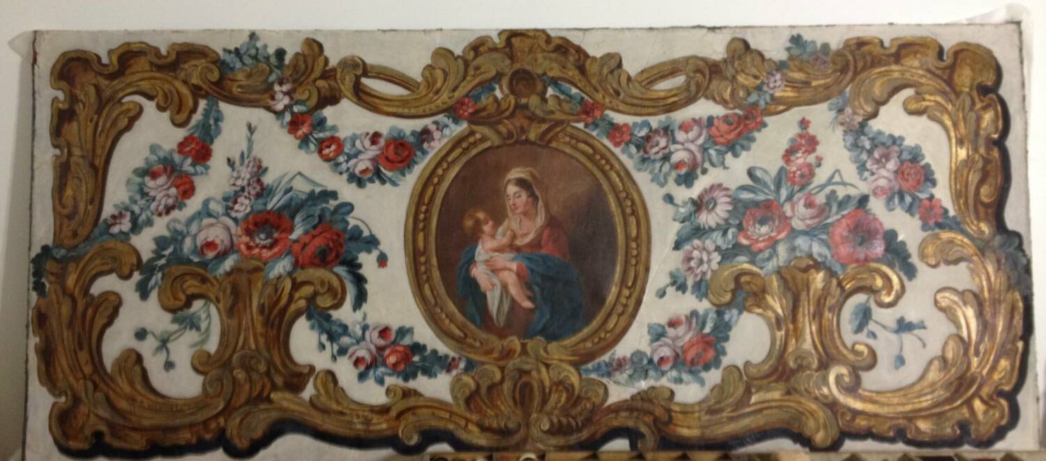 composé probablement de 2 peaux de veaux (de tannage végétal) collées ensemble. Une couche picturale représentant la vierge à l’enfant avec un décor floral et de guirlandes sur fond blanc est présent. L’ensemble est entoilé sur une toile (type chanvre) et encadré par le bois de l’autel.