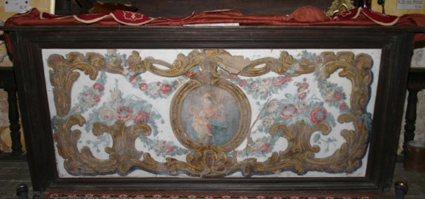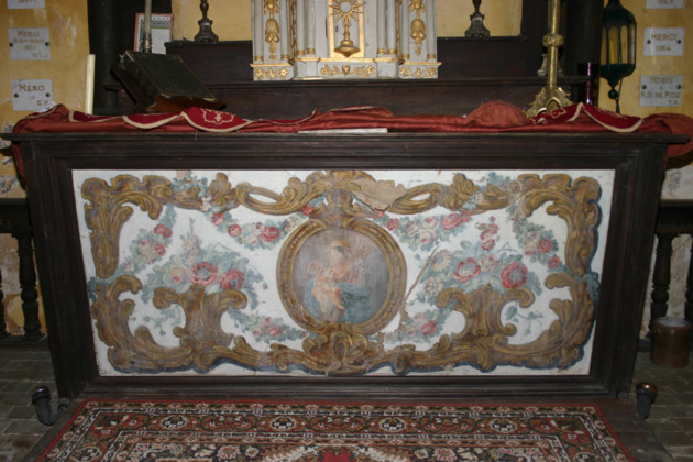 L’autel principal de la chapelle comporte dans sa partie basse, un antependium en cuir peint d’environ 2 m sur 1 m. Le panneaux est